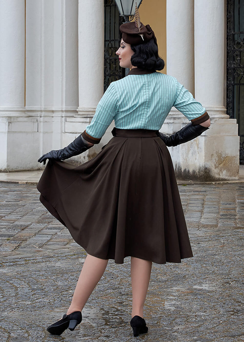 Que ce soit au bureau, lors d’un rendez-vous dans un diner américain ou pour finir par une soirée Rock ‘n Roll, vous êtes éclatante comme un événement des années 50! La robe Roxanne est un véritable élément de mode, avec son coloris menthe frais associé à une élégante jupe évasée marron. La taille est idéalement mise en valeur avec une ceinture amovible, tandis que la jupe ample dotée de poches pratiques vous confère une allure rétro sans effort. Cette robe est parfaite pour créer un look vintage enchanteur cet automne!