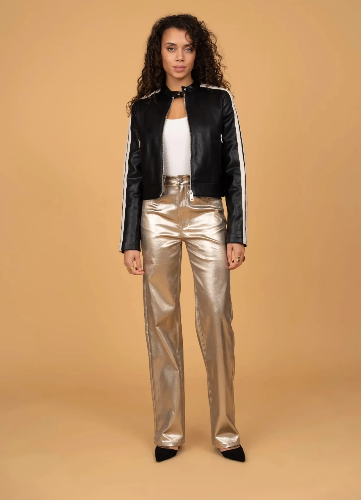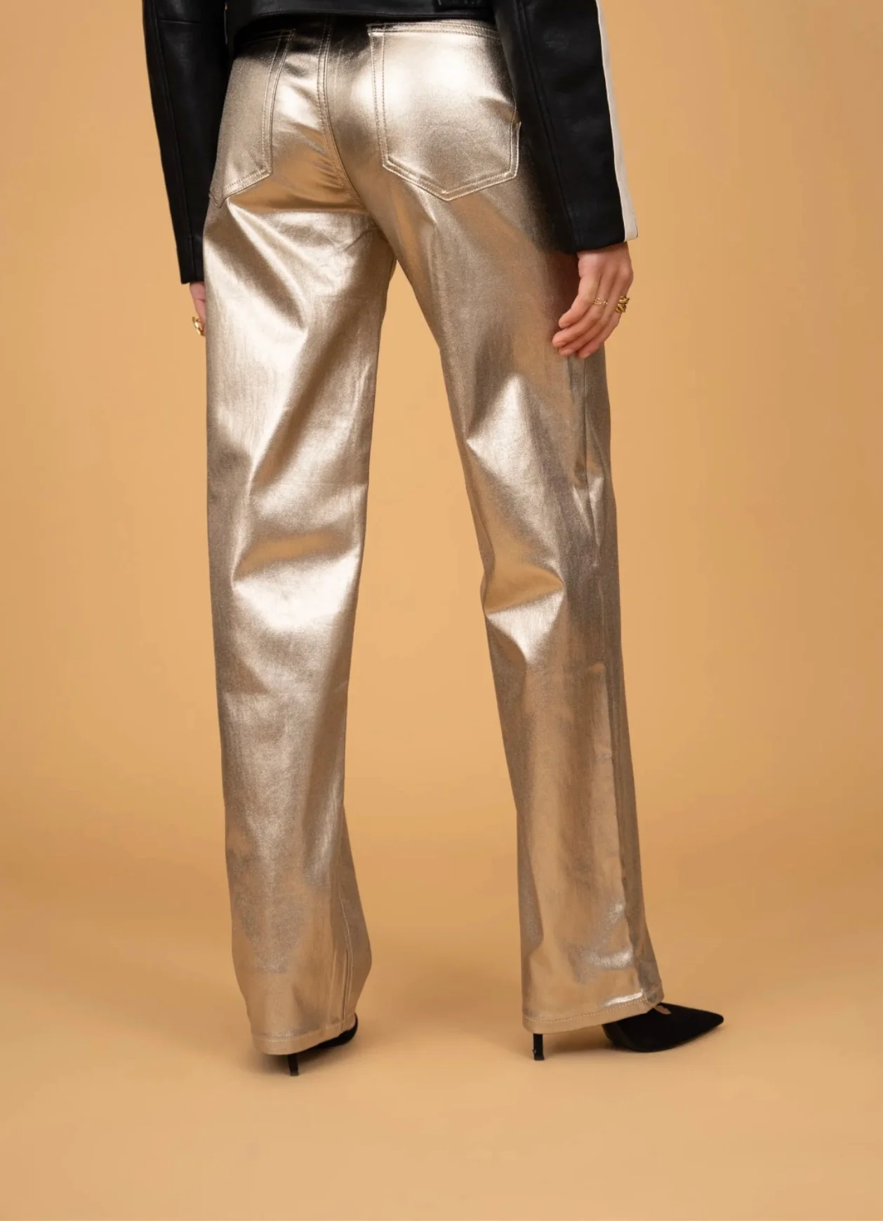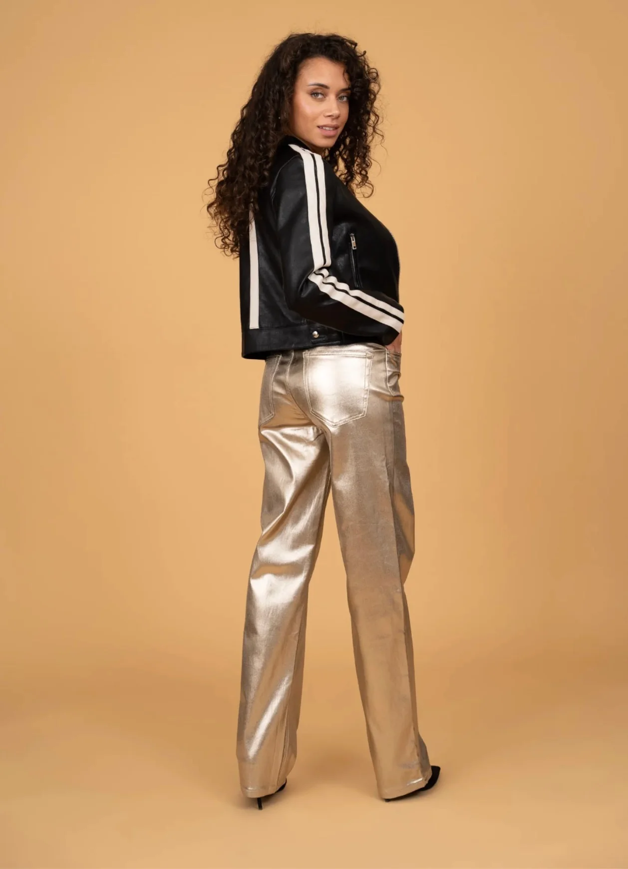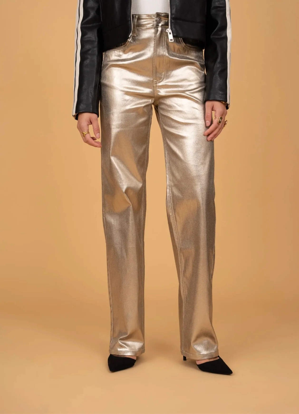 Pantalon wide leg enduit au look audacieux et contemporain, parfait pour apporter une touche lumineuse à vos tenues. Sa texture métallisée capte la lumière et crée une allure chic et affirmée. Sa taille haute et sa coupe large allongent la silhouette tout en offrant confort et style.