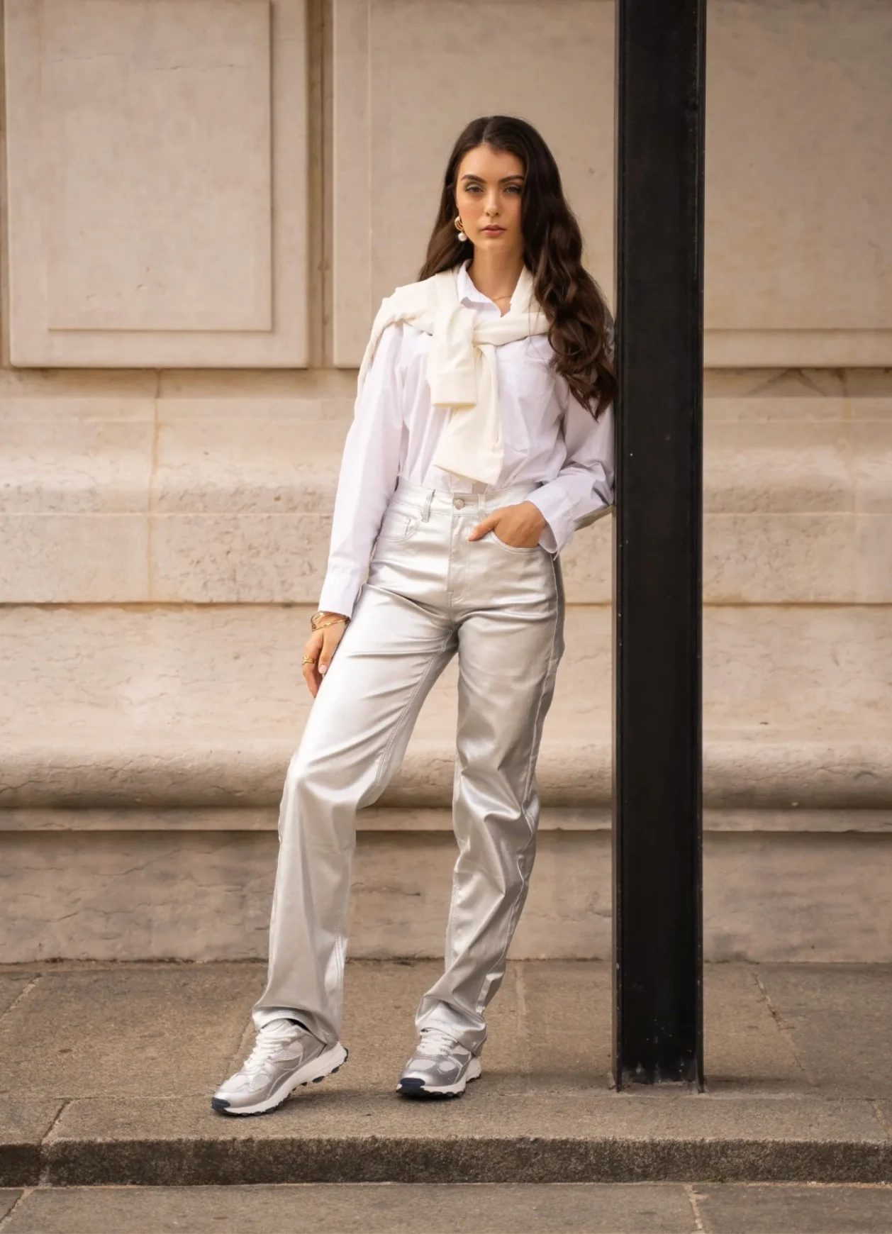 Pantalon wide leg enduit au look audacieux et contemporain, parfait pour apporter une touche lumineuse à vos tenues. Sa texture métallisée capte la lumière et crée une allure chic et affirmée. Sa taille haute et sa coupe large allongent la silhouette tout en offrant confort et style. Détails : Coupe : Wide leg fluide, jambe […]
