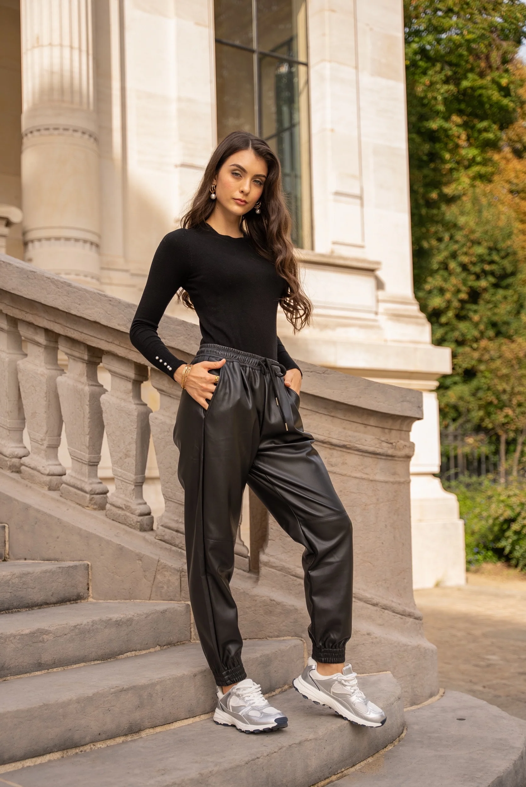 Pantalon jogger en simili cuir, alliant style urbain et confort moderne. Parfait pour un look casual chic avec une touche d’audace. Sa coupe ample et sa taille élastique assurent une grande liberté de mouvement tout en restant tendance.