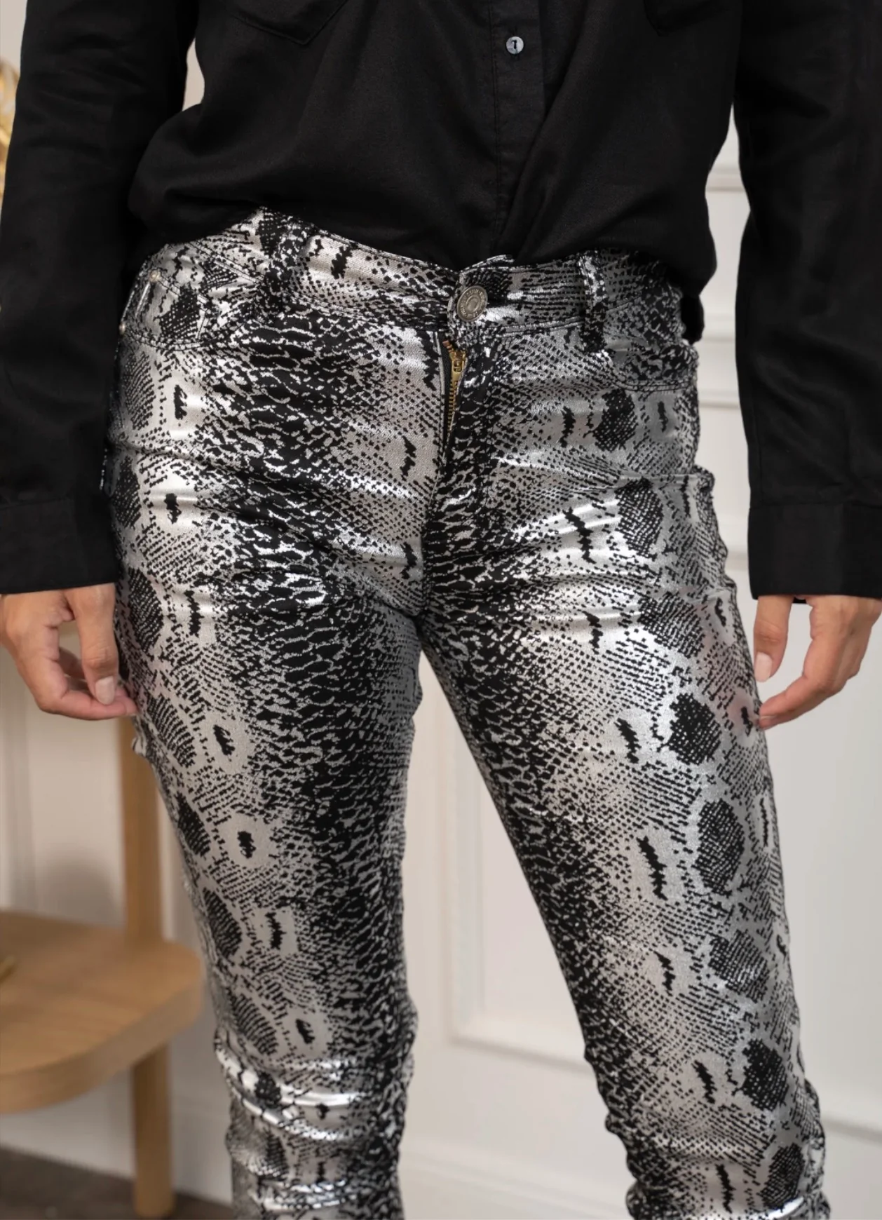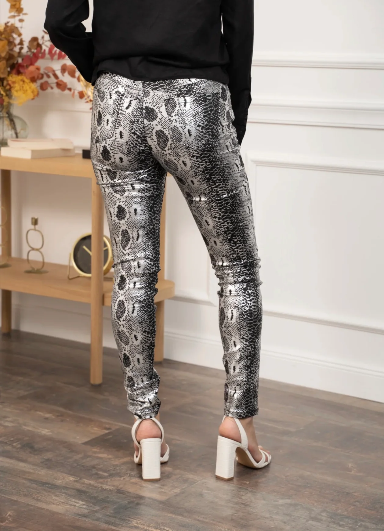 Ce pantalon slim argenté à motif serpent apporte une touche audacieuse et ultra-mode à vos tenues. Sa matière légèrement satinée capte la lumière pour un effet métallisé tendance, tout en restant confortable et agréable à porter. La coupe ajustée valorise la silhouette, tandis que l’imprimé reptile noir et argent crée un look affirmé, idéal pour une soirée, un évènement ou pour dynamiser une tenue basique. Associé à un top noir ou blanc, il devient la pièce forte de votre dressing.