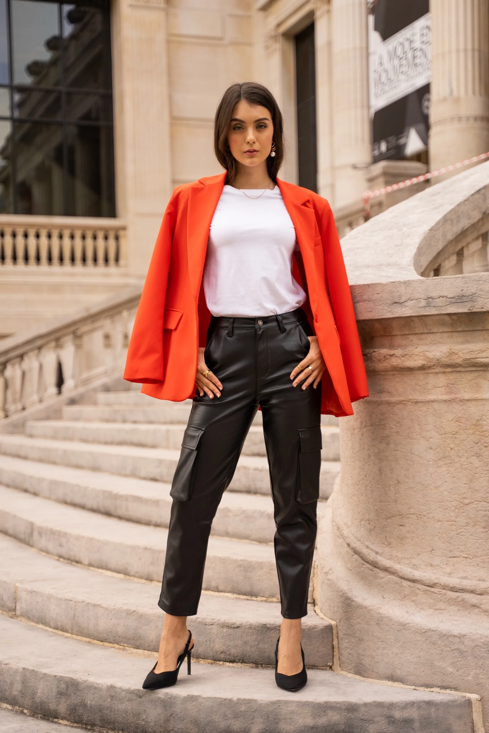 Pantalon cargo en simili cuir, parfait pour un look urbain, structuré et tendance. Il allie allure utilitaire et esprit chic, tout en restant confortable grâce à sa matière souple et légèrement brillante.