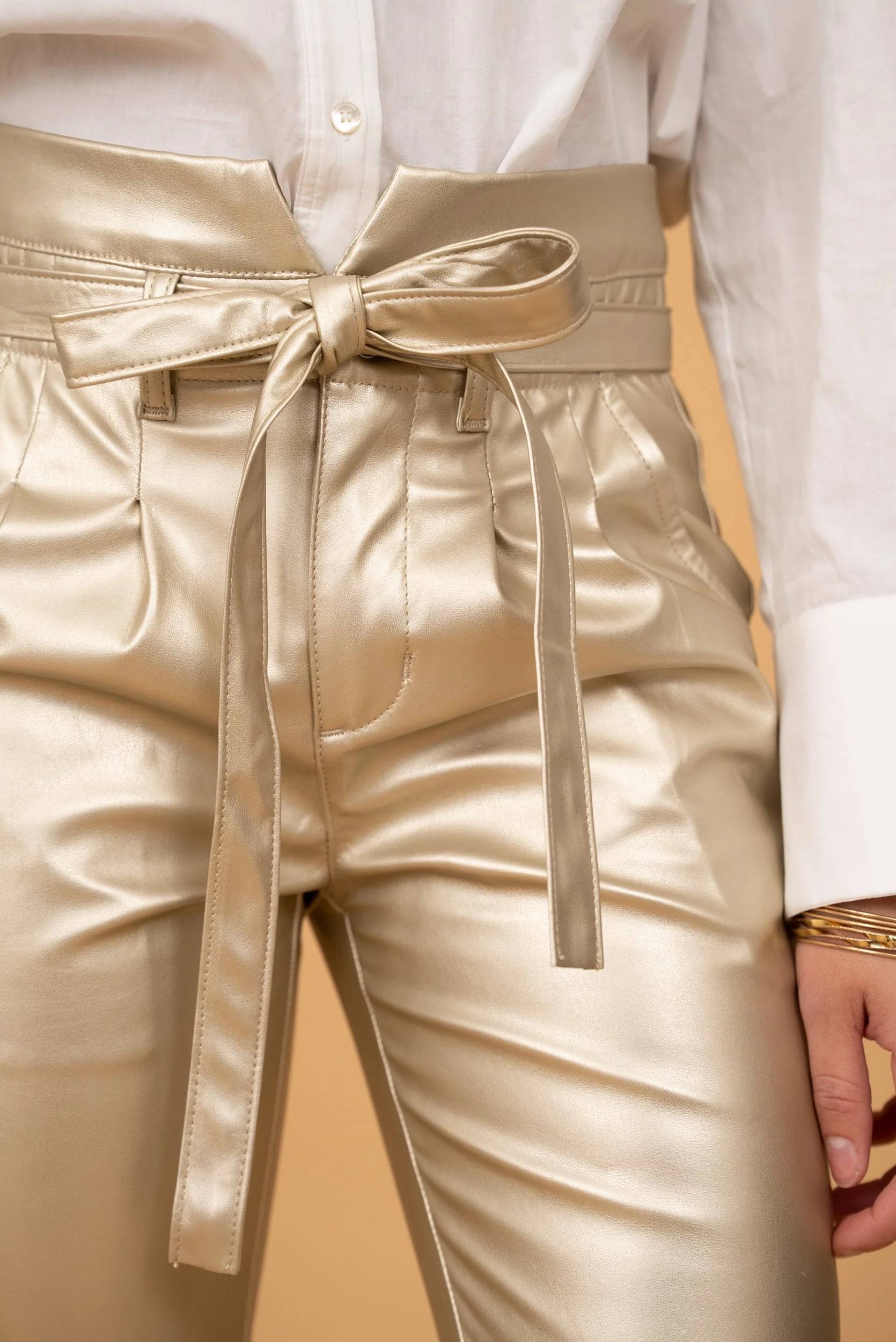 Pantalon paperbag doré en simili cuir, une pièce forte et lumineuse pour un look audacieux et raffiné. Sa coupe flatteuse et sa matière brillante apportent élégance et caractère à la silhouette.