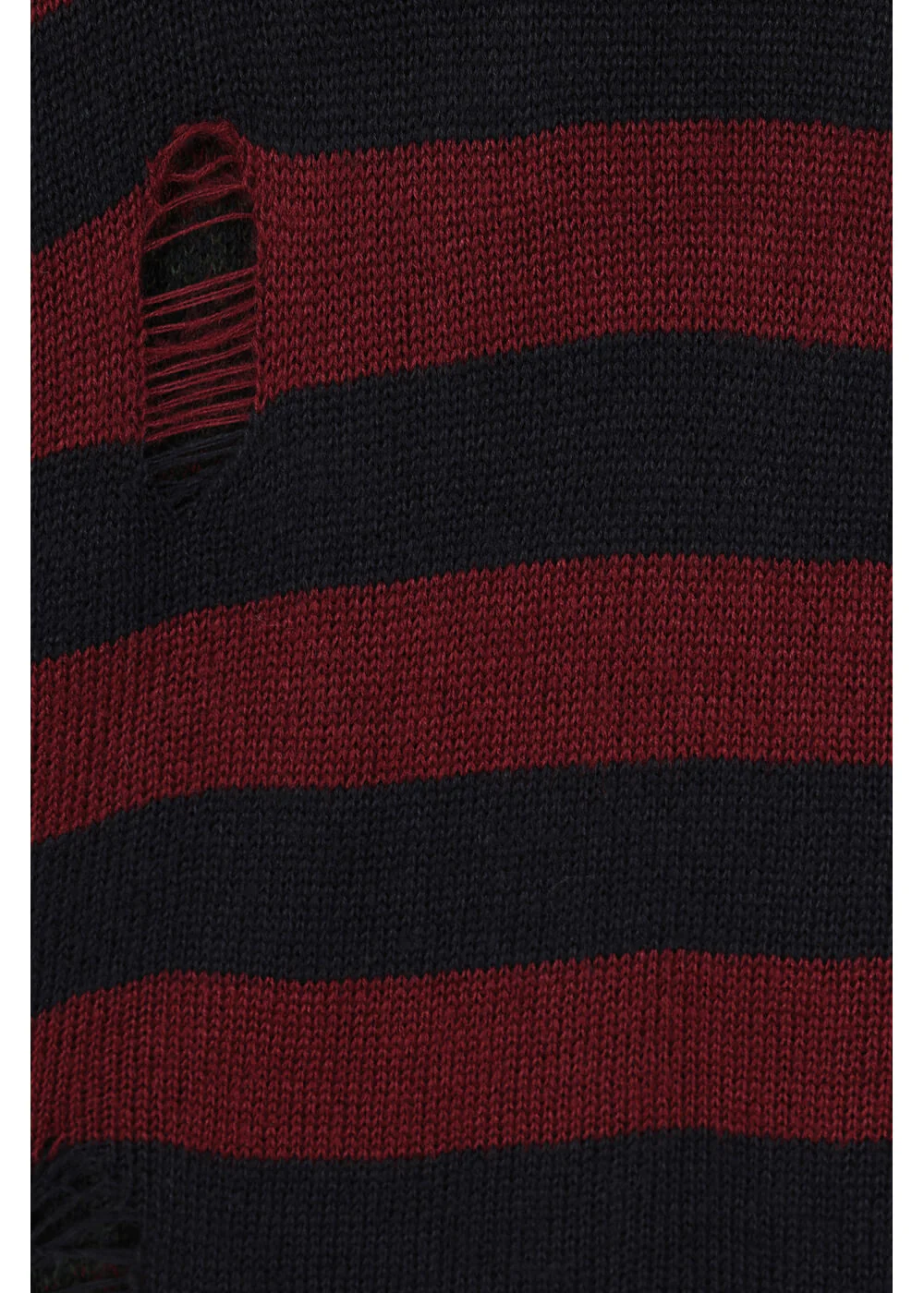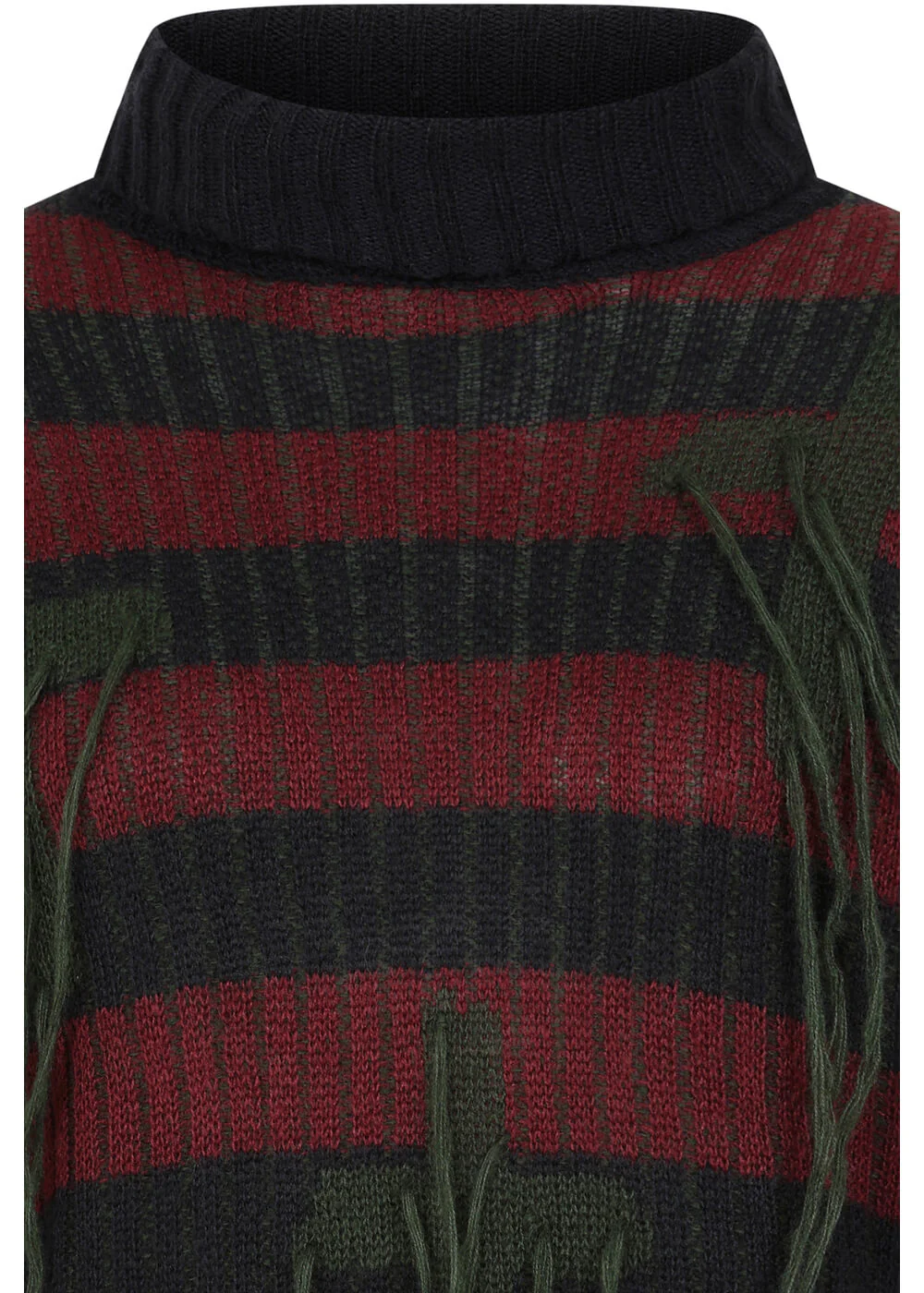 – Rayures burgundy-navy sur le corps, rayures burgundy-vertes sur les manches