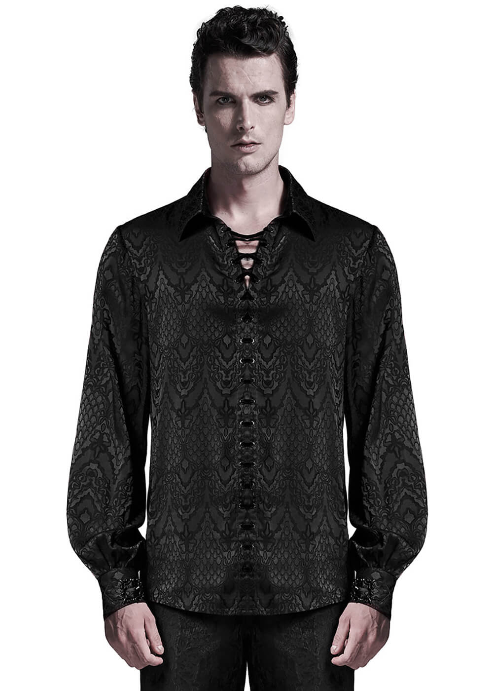 Voor een poetische vampierlook, weergaloze piraten outfit of omdat je zo van de voorkant van een romannetje af wil stappen, met Dorian doe jij hoofden draaien! Met zijn subtiele glans-finish, slangen-geinspireerd patroon en veterdetail is dit het shirt waar je niet zonder wil. En je kan jezelf toch geen ongelijk geven?
