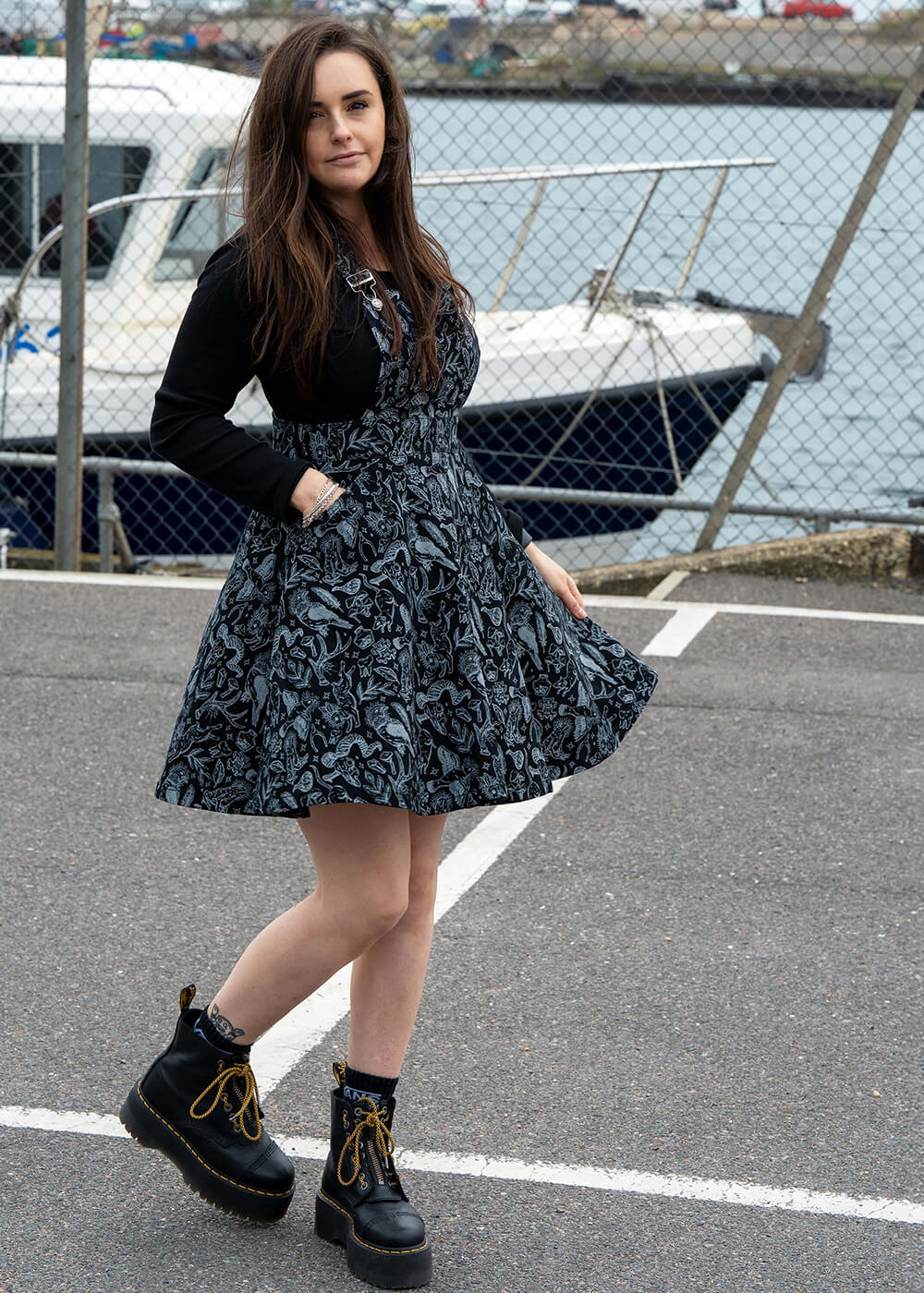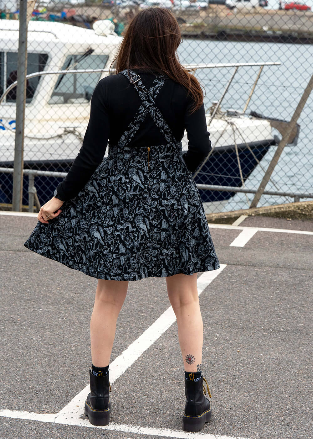 Le rabat avant avec sa petite poche emblématique confère un look reconnaissable et est fixé par des boutons aux bretelles réglables. La jupe se ferme par une fermeture éclair au dos et s’épanouit depuis la ceinture en une jupe swing qui, sur une personne de 1,70 m, arrive au-dessus du genou. Qui résisterait à ce style de « dopamine dressing » ?