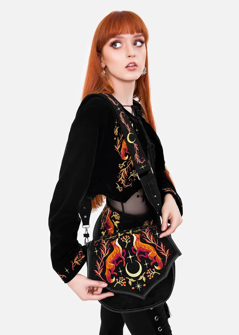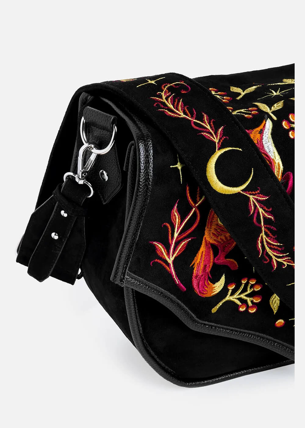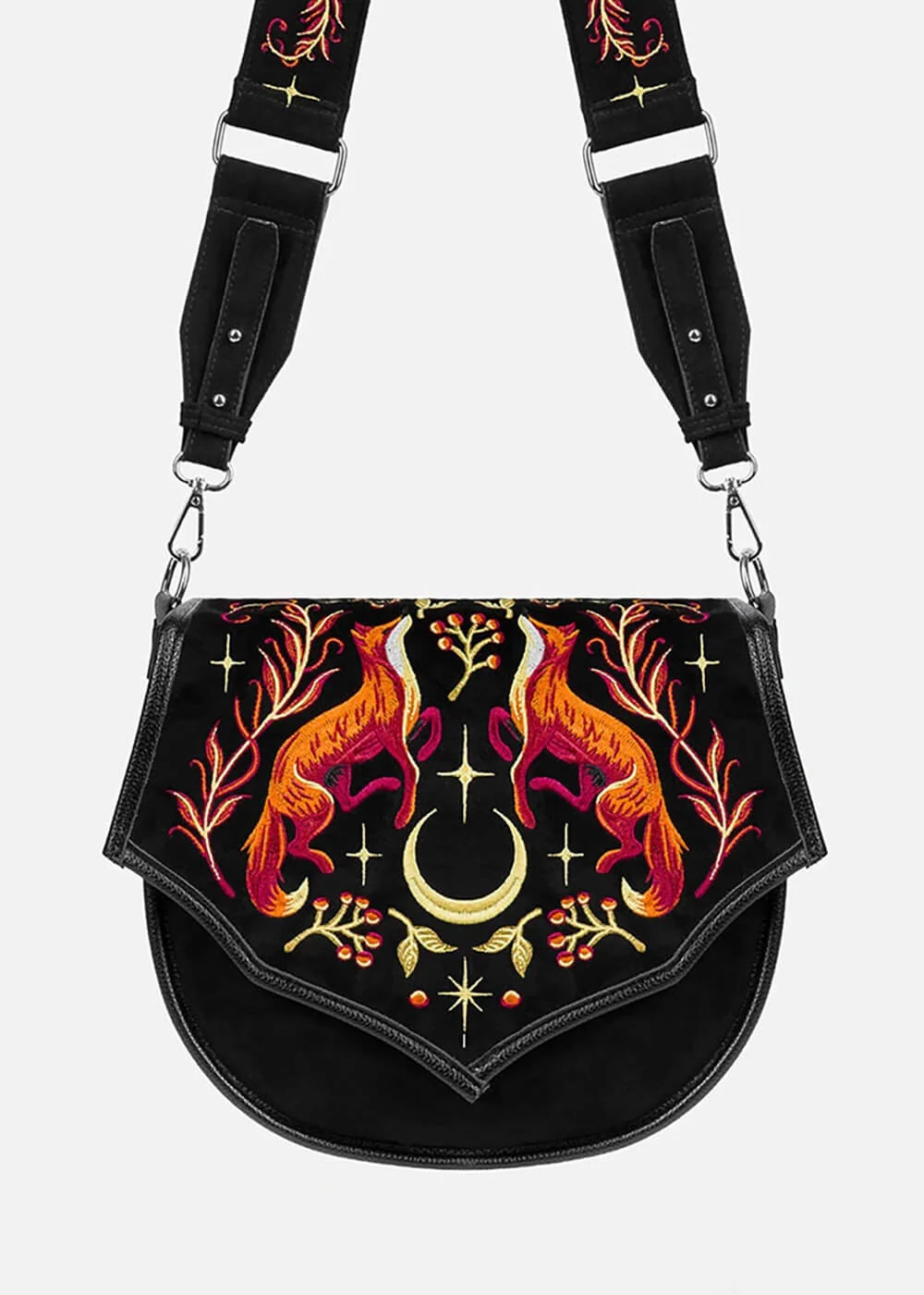 Dans un esprit Cottagecore, le Foxfire Nights vous séduira avec son faux-suède noir et ses broderies mystiques de renards enflammés. À la fois élégant et fonctionnel, il est parfaitement dimensionné pour vos indispensables de jour comme de nuit, pour garder vos Witchy Vibes à portée de main ♥