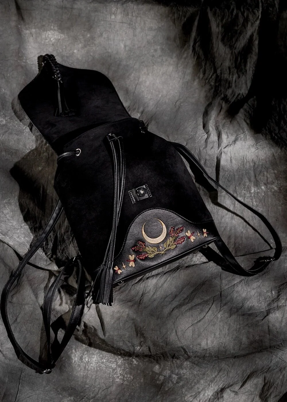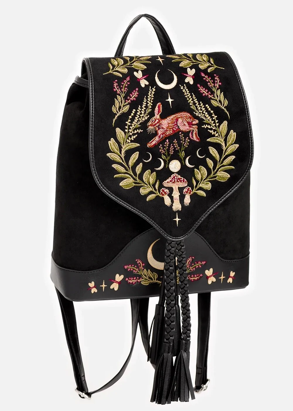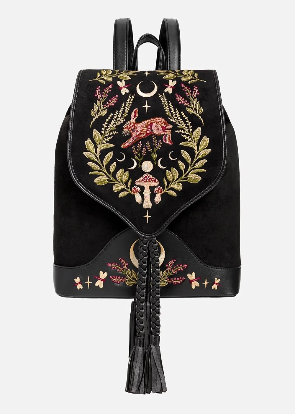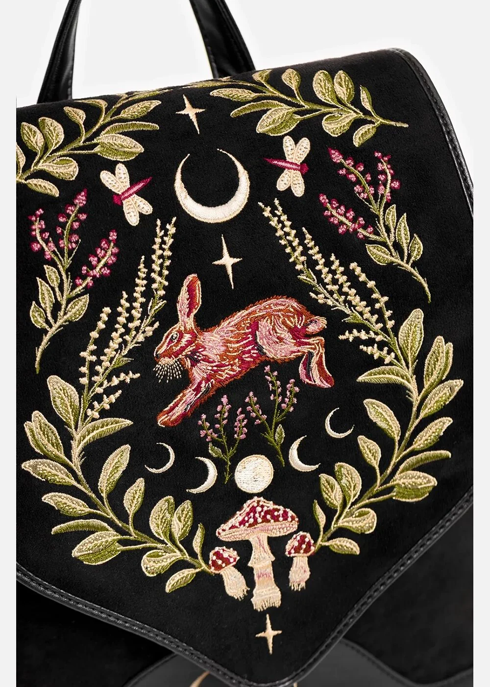 Évidemment dans un style Cottage Core complet avec le sac à dos Hare Moon qui vous coupera le souffle avec son faux daim noir orné de broderies mystiques de plantes et ce petit lièvre… Pratique (tout comme votre magie), il est bien sûr juste assez grand pour tous vos indispensables quotidiens (ou nocturnes). Ainsi, vous avez toujours vos Vibes de Sorcière à portée de main ♥
