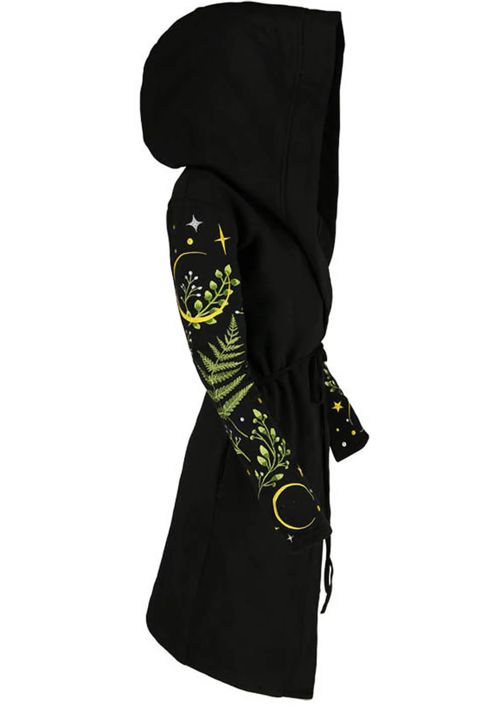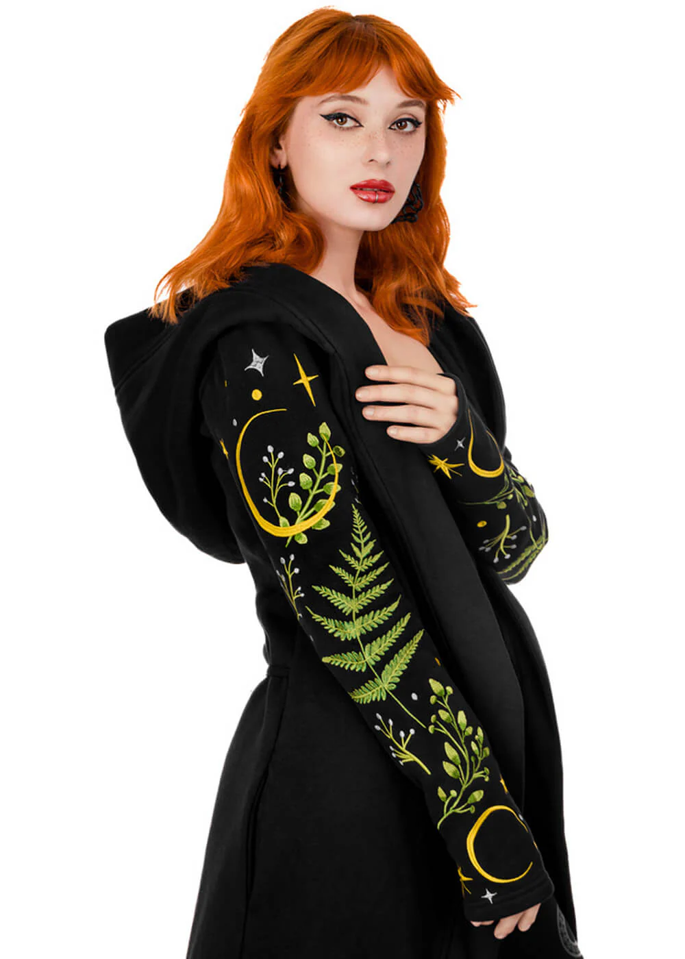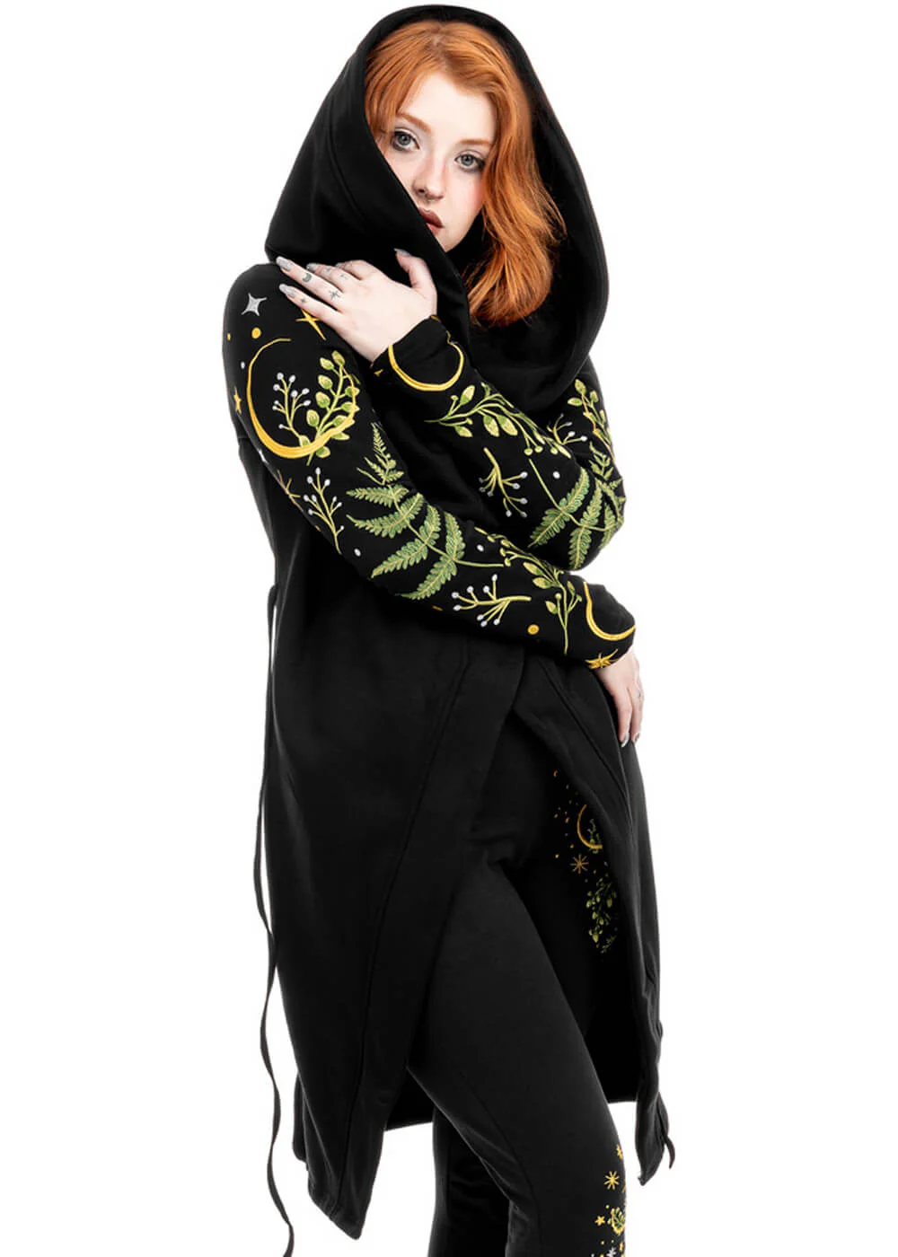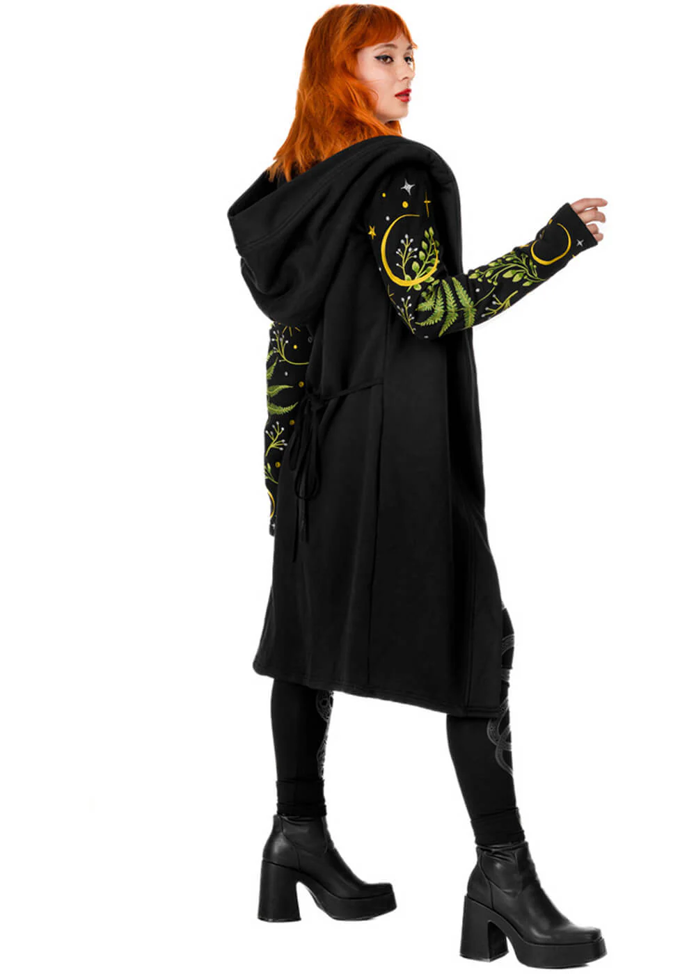 Weerhoudt jouw Gothic kledingstijl je er niet van jouw liefde voor de natuur en alles daarboven te uiten? Dan steelt Restyle wellicht jouw hart met deze prachtige hoodie van heerlijk dik katoen! Ze is voorzien van prachtige borduursels op de mouwen en kan open of gesloten worden gedragen dankzij het taillekoord. Werkelijk magisch!
