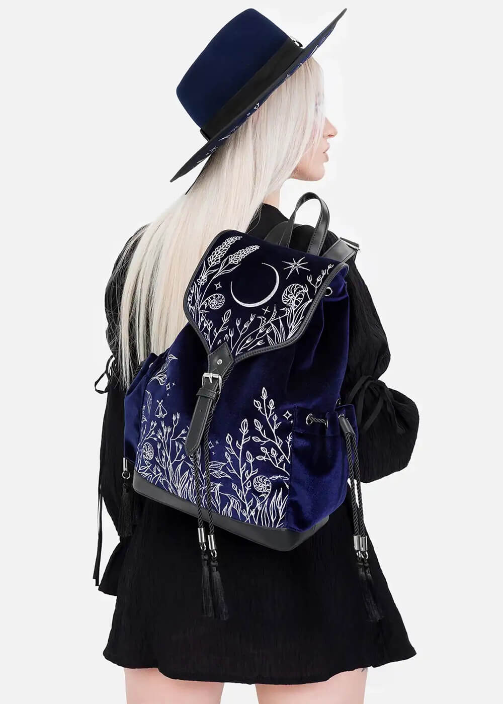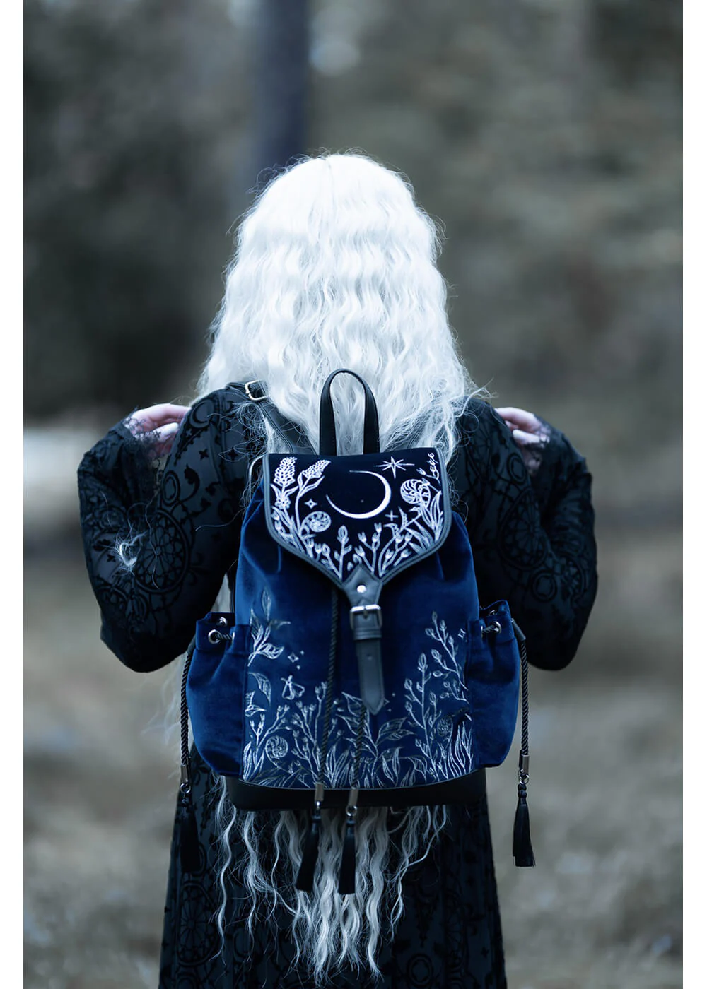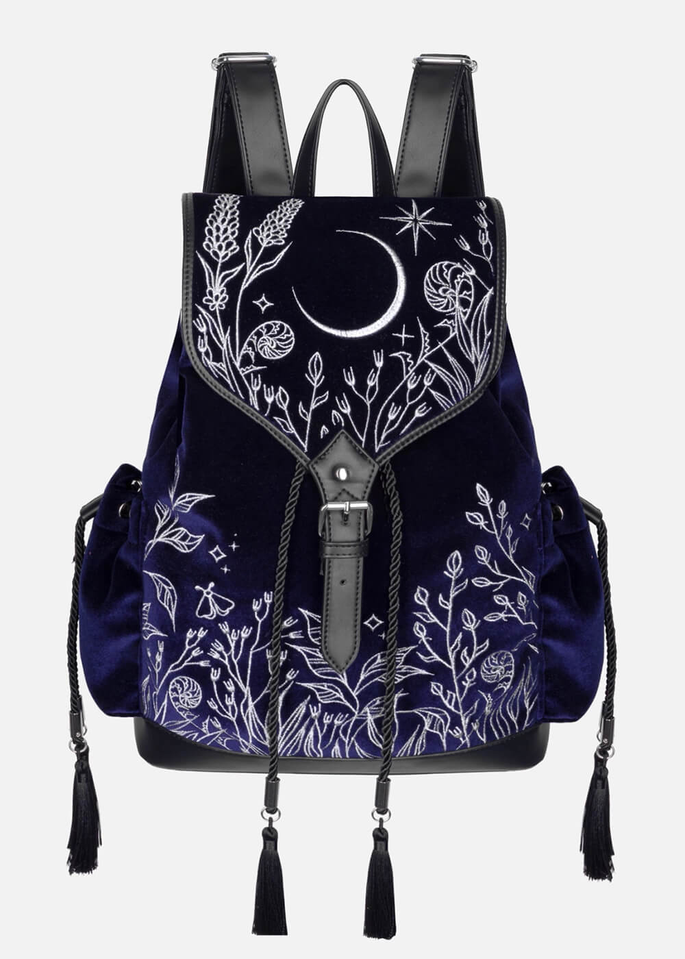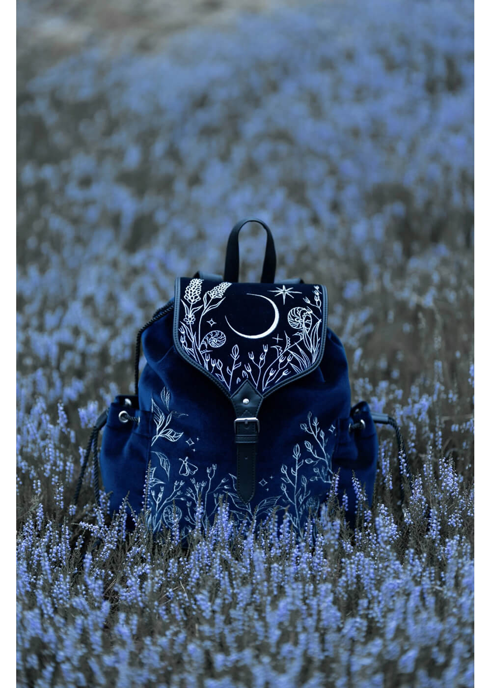 Dans un esprit cottagecore, la Moonlit Meadow vous séduira : velours bleu nuit orné de broderies mystiques représentant un croissant de lune, des papillons de nuit et des plantes. Aussi pratique que votre magie, elle est parfaitement dimensionnée pour vos affaires de tous les jours (ou de la nuit). Gardez vos ondes witchy près de vous ♥