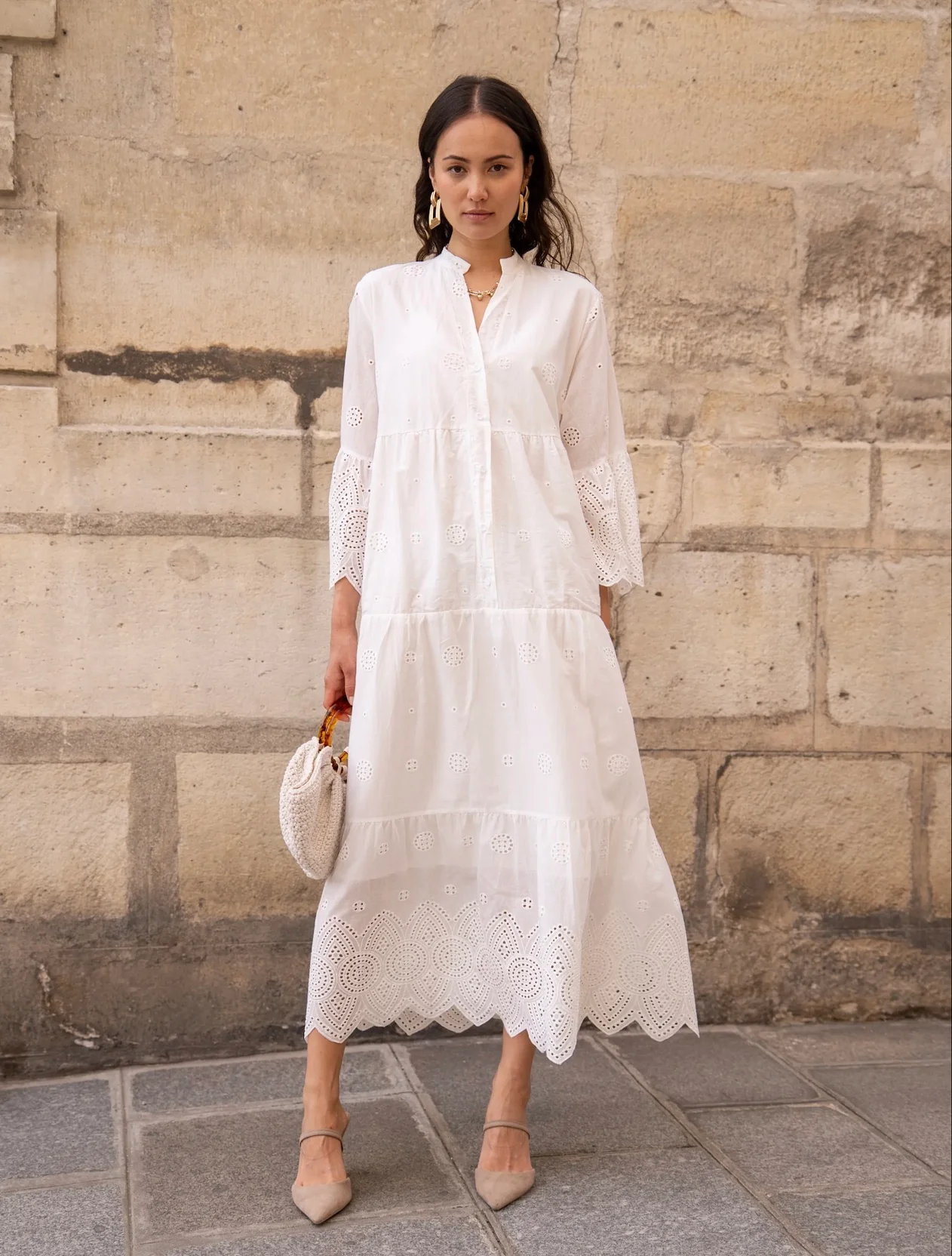 Cette robe longue évoque une élégance naturelle et intemporelle. Fluide et légère, elle est ornée de délicates broderies anglaises géométriques qui apportent texture et finesse. Sa coupe ample et sa patte de boutonnage discrète sur le devant la rendent facile à porter au quotidien, tout en étant subtilement sophistiquée.