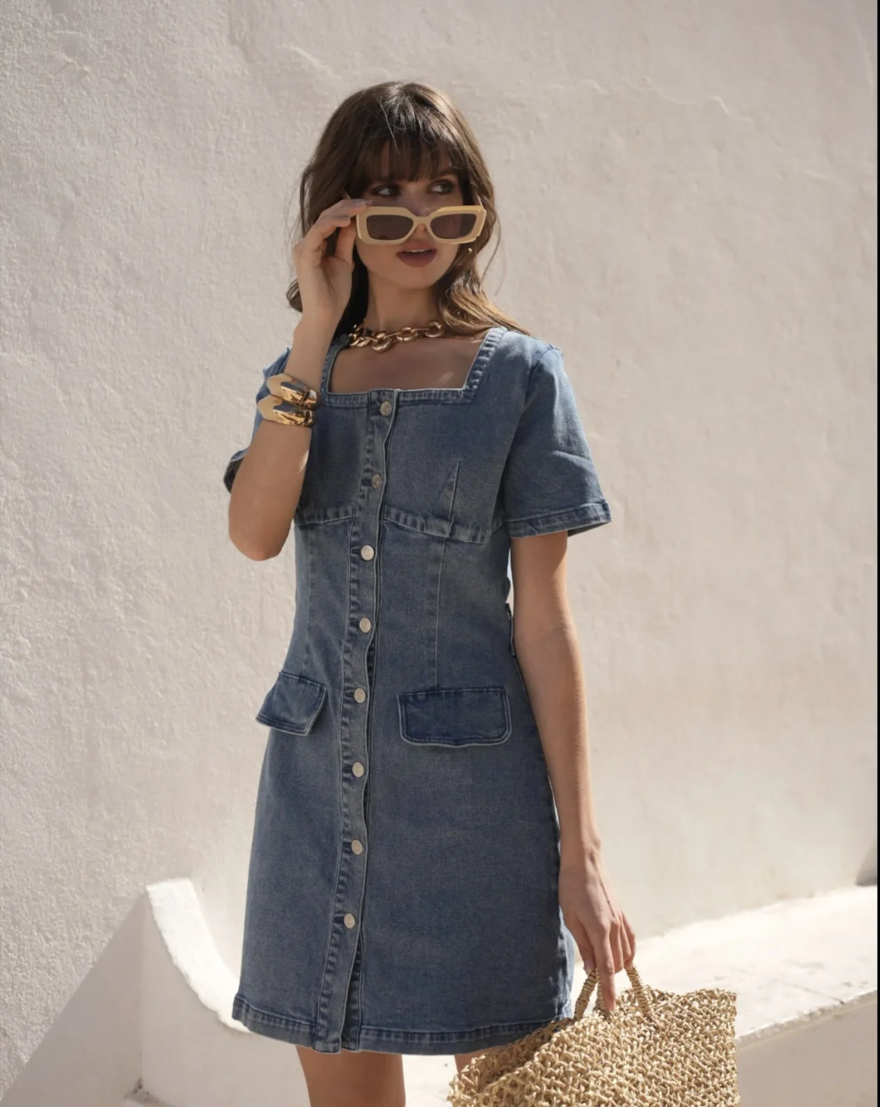 Robe courte en denim au style chic et décontracté, idéale pour la saison estivale. Sa coupe féminine et ses détails utilitaires en font une pièce facile à porter au quotidien, tout en restant tendance.