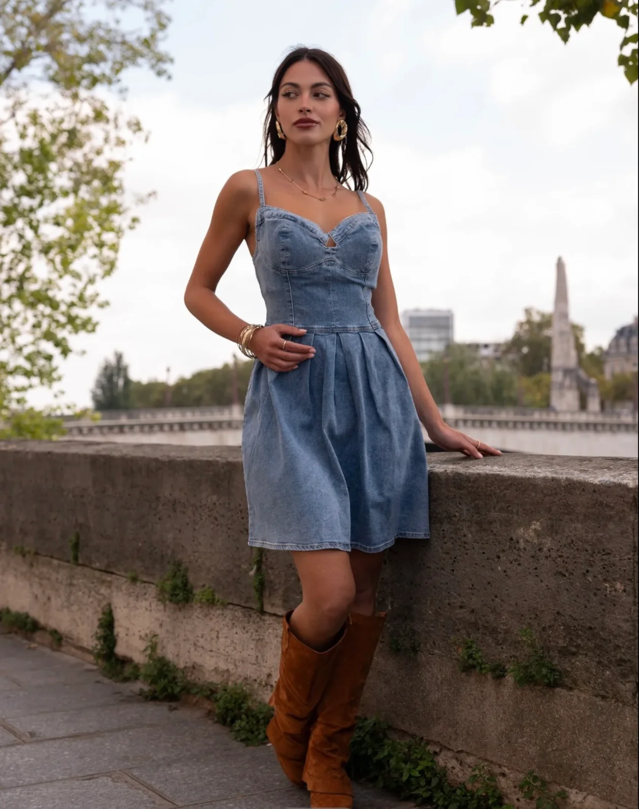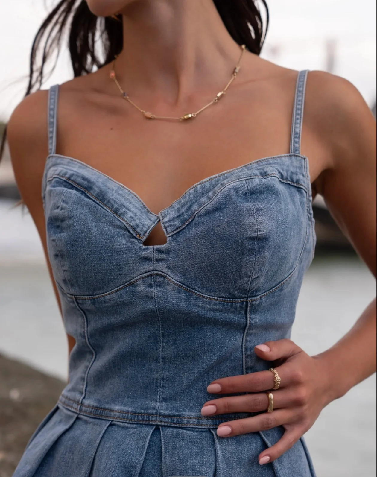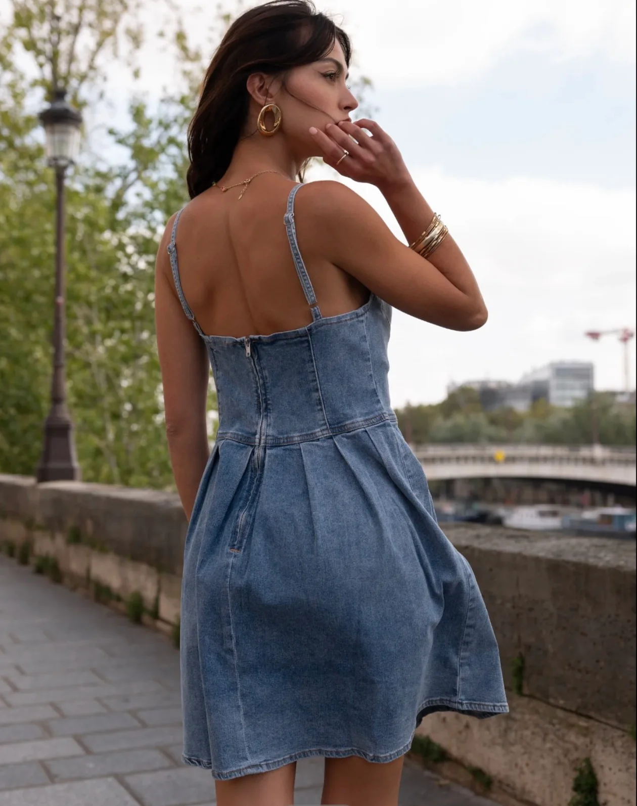Robe courte en denim au style rétro-chic et féminin, parfaite pour les journées ensoleillées ou un look décontracté raffiné. Sa coupe flatteuse met en valeur la silhouette tout en offrant un joli volume grâce aux plis de la jupe.