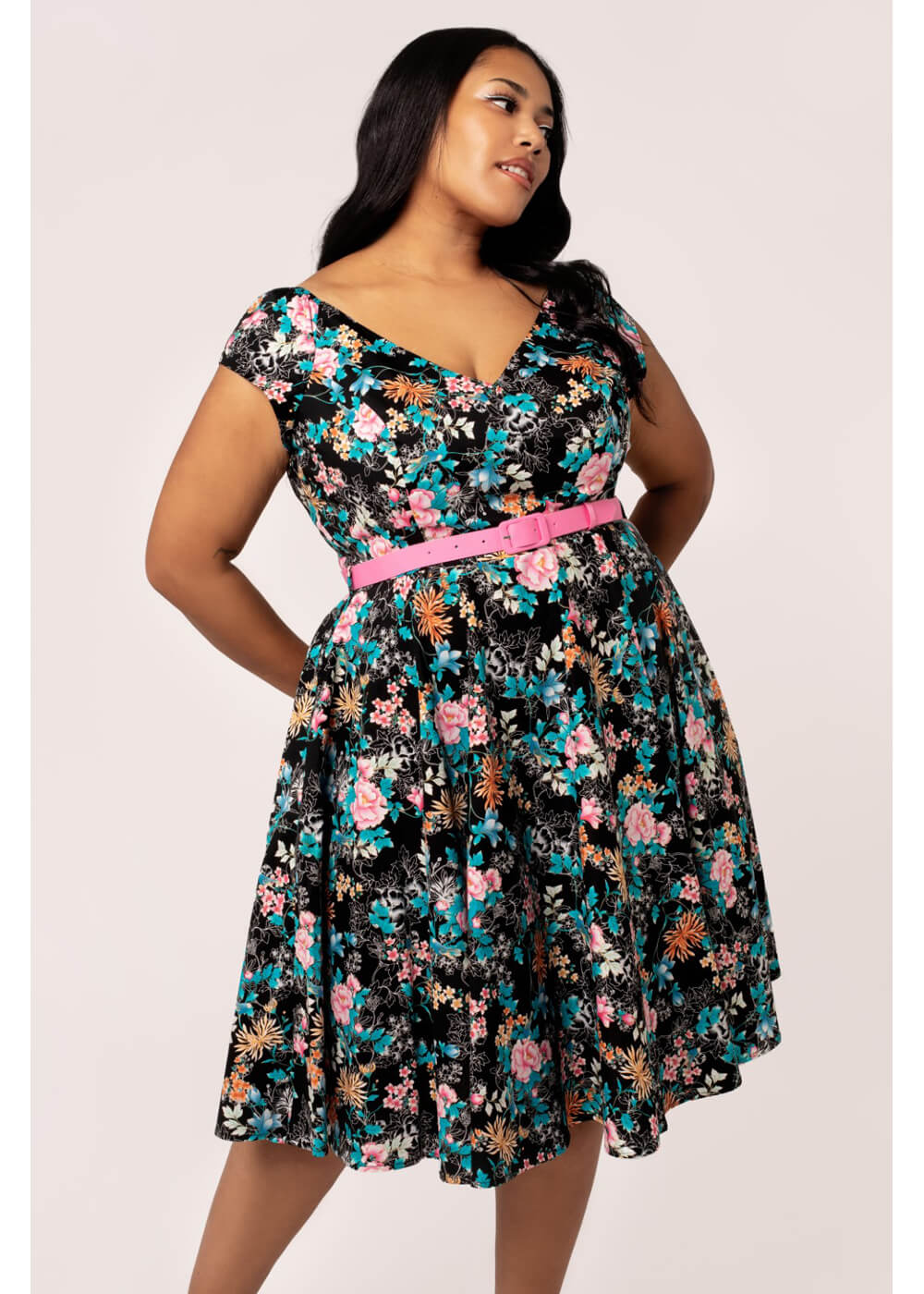 Profitez de fleurs éclatantes toute l’année !rnrnUne journée shopping au printemps ? Une sortie estivale ? Un dîner en automne ? Quelle que soit la saison, Umi est votre préférée ! Son ravissant motif floral se détache sur le fond noir en coton mélangé et sa ceinture offre la silhouette parfaite des années 50. Le seul inconvénient : vous devez malheureusement l’enlever à la fin de la journée…rnrn- Fabriquée en mélange de coton avec une légère élasticitérn- Fermeture éclair au dosrn- S’évase depuis la taille en une jupe amplern- Peut être sublime avec un juponrn- Ceinture amovible inclusern- Manches courtes légèrement dégagéesrn- Encolure en Vrn- Coutures princessern- Arrive juste sous les genoux pour une taille de 1,70 mrn- Poches pratiques !rn- 98 % coton – 2 % élasthannern- Lavage à 30 °C, pas de séchage ni de nettoyage à sec, repassage doux