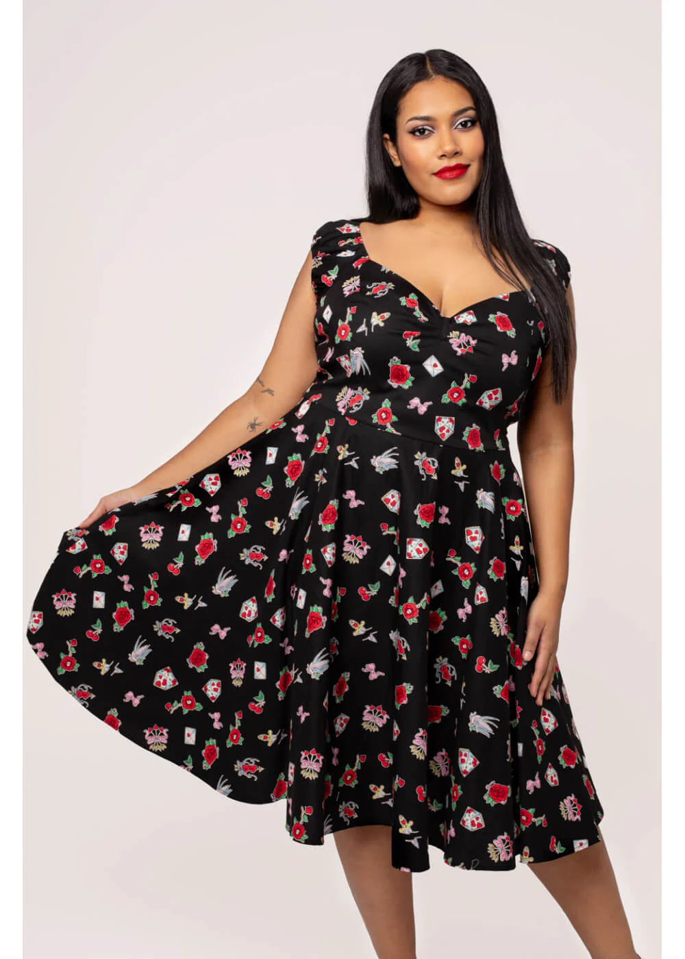 Cerises, dagues, crânes et roses, hirondelles : tous tes icônes préférées du Rock ‘n Roll sont là ! Une telle beauté, tu veux l’emmener partout : à un festival avec des bottes robustes, au bureau avec des ballerines et bien sûr en terrasse avec des talons. Où vas-tu d’abord présenter Carlotta ?