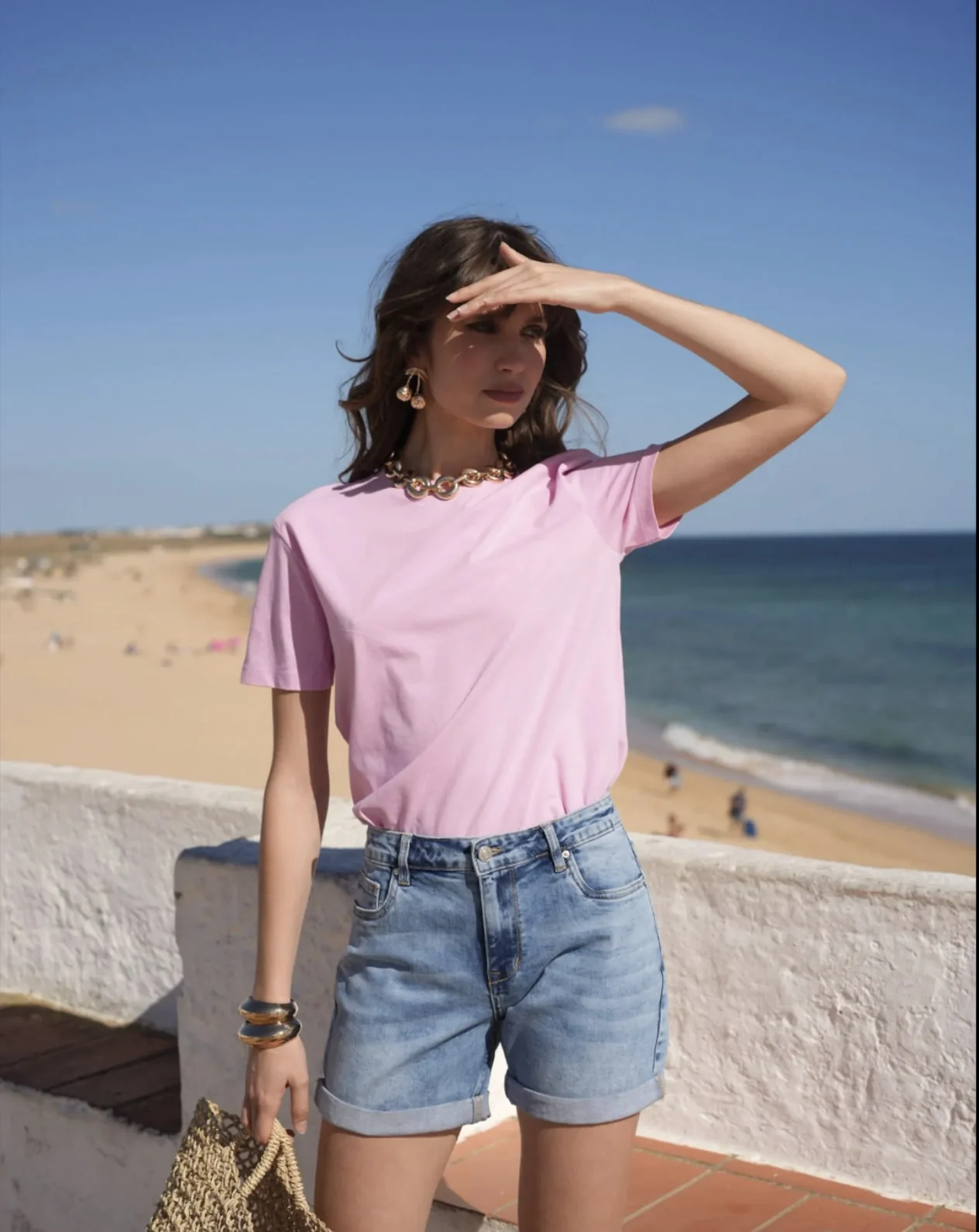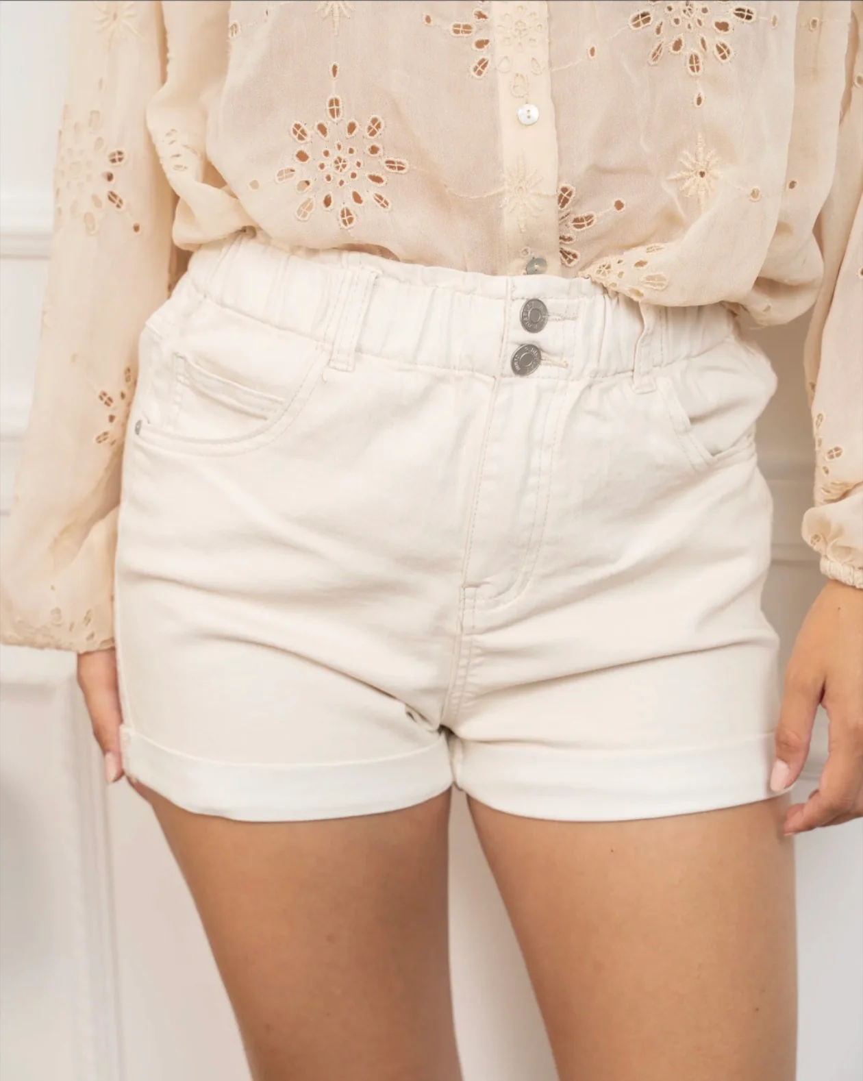 Short en jean ajusté à taille haute, alliant confort et allure soignée. Parfait pour composer des looks estivaux décontractés tout en restant élégante.