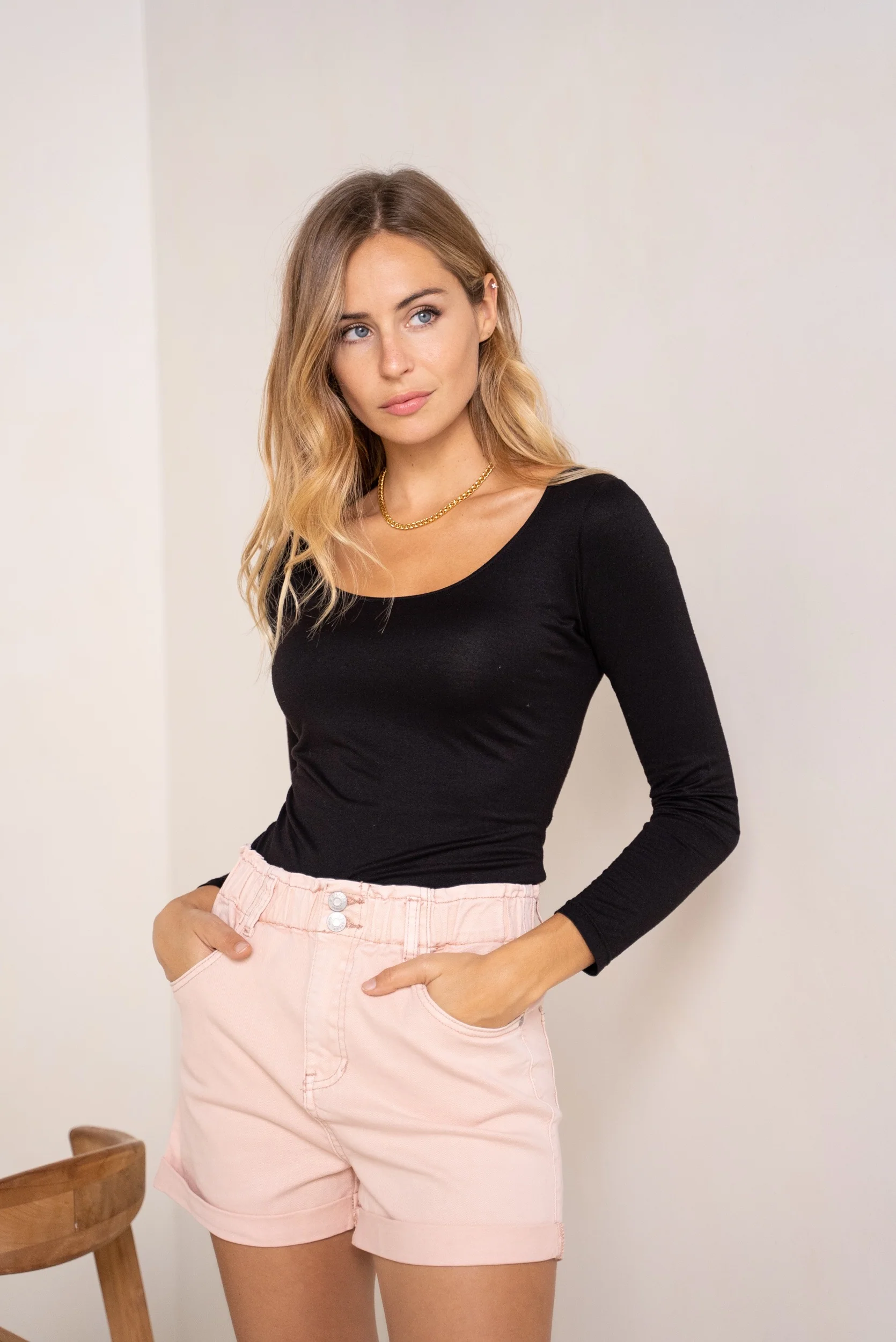 Ourlet retroussé, longueur mi-cuisse pour un look soigné et tendance.