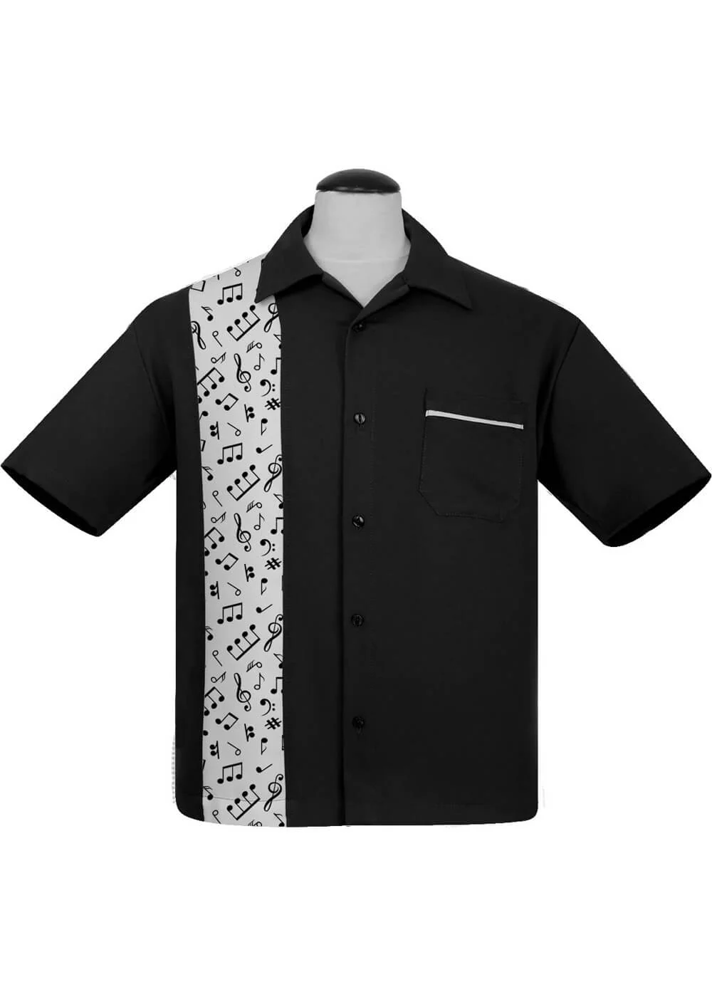 Steady Clothing Heren Music Note Panel Bowling Shirt Zwart Wit