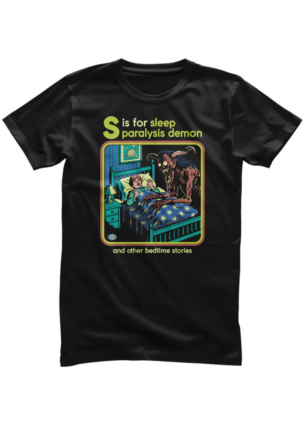 Illustrations rétro pleines d’un humour noir qui semblent innocentes mais cachent autre chose.rnAffirmez votre style avec ce T-shirt inquiétant, orné d’un visuel façon schéma éducatif représentant un démon de la paralysie du sommeil.rnLes T-shirts Steven Rhodes ont une coupe décontractée et sont conçus en 100 % coton avec une légère élasticité, pour qu’ils deviennent vite vos préférés.rnQui résisterait à un motif aussi doux et pourtant si dérangeant ?rnrn- Visuel: Steven Rhodesrn- Coupe décontractéern- Dos unirn- Coton haut de gamme avec légère élasticitérn- Sur une personne de 1,70 m, arrive sur les hanchesrn- Lavage à 30 °C, ne pas sécher au sèche-linge, ne pas utiliser la vapeur ni javelliserrn- Repasser à l’envers à basse température