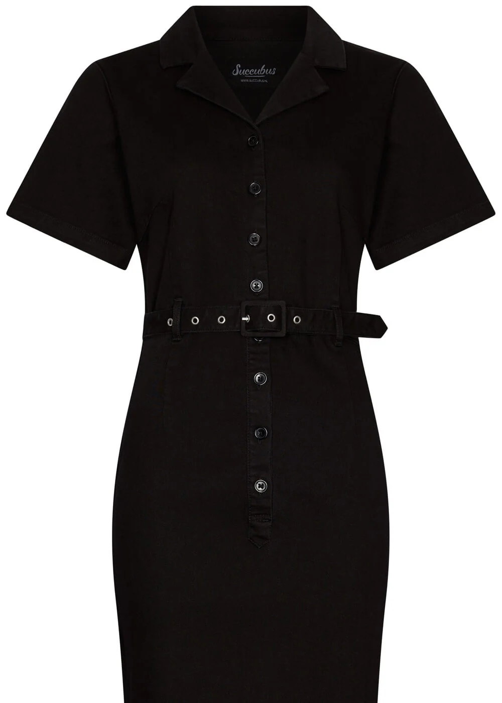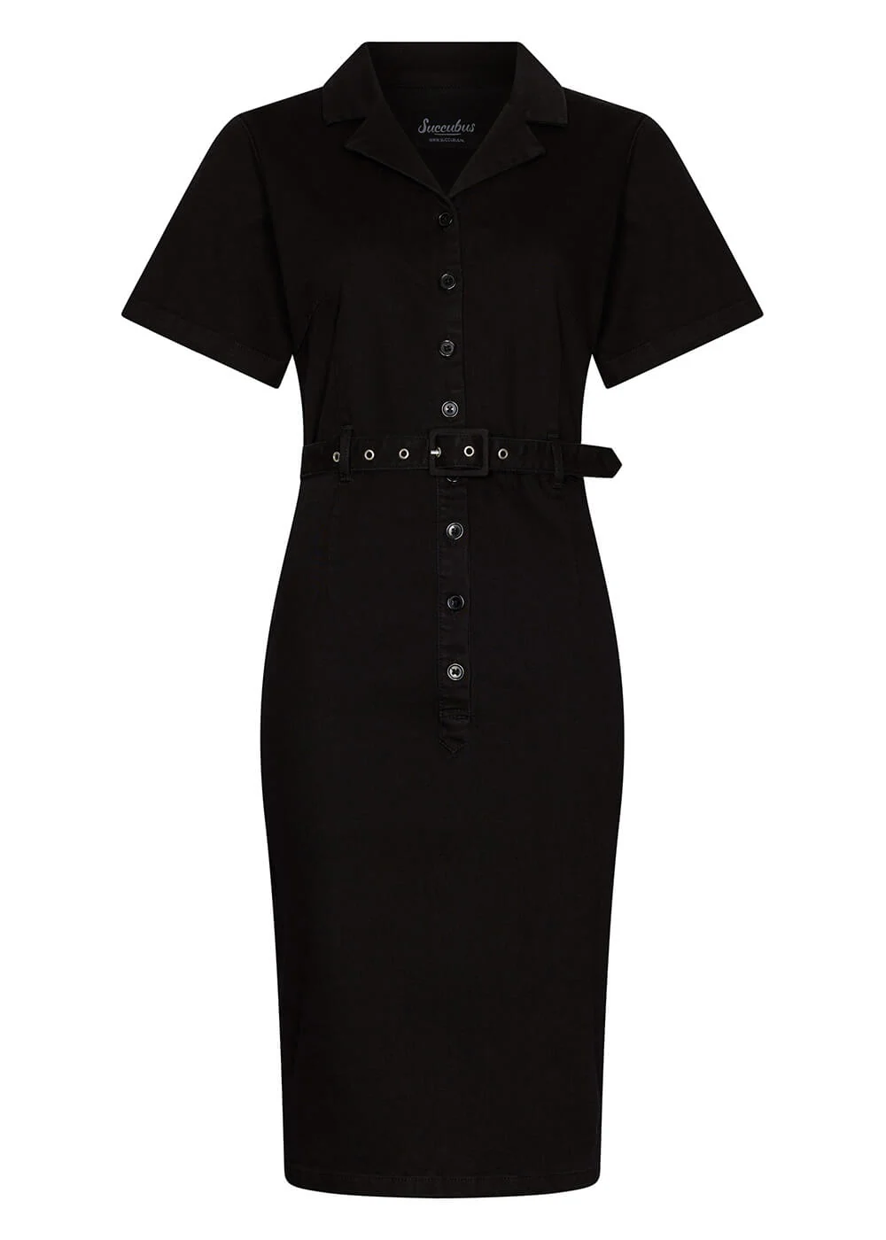 La robe crayon rockabilly indispensable : sa coupe chemisier et ses boutons lisses font de Ruby votre nouvelle pièce rétro préférée, tandis que le mélange denim-coton légèrement extensible apporte un effet Vavavoom qui sublime les courbes. Parfaite pour passer du bureau à la soirée Rock ‘n’ Roll. Avec Ruby, rien ne vous retient ♥