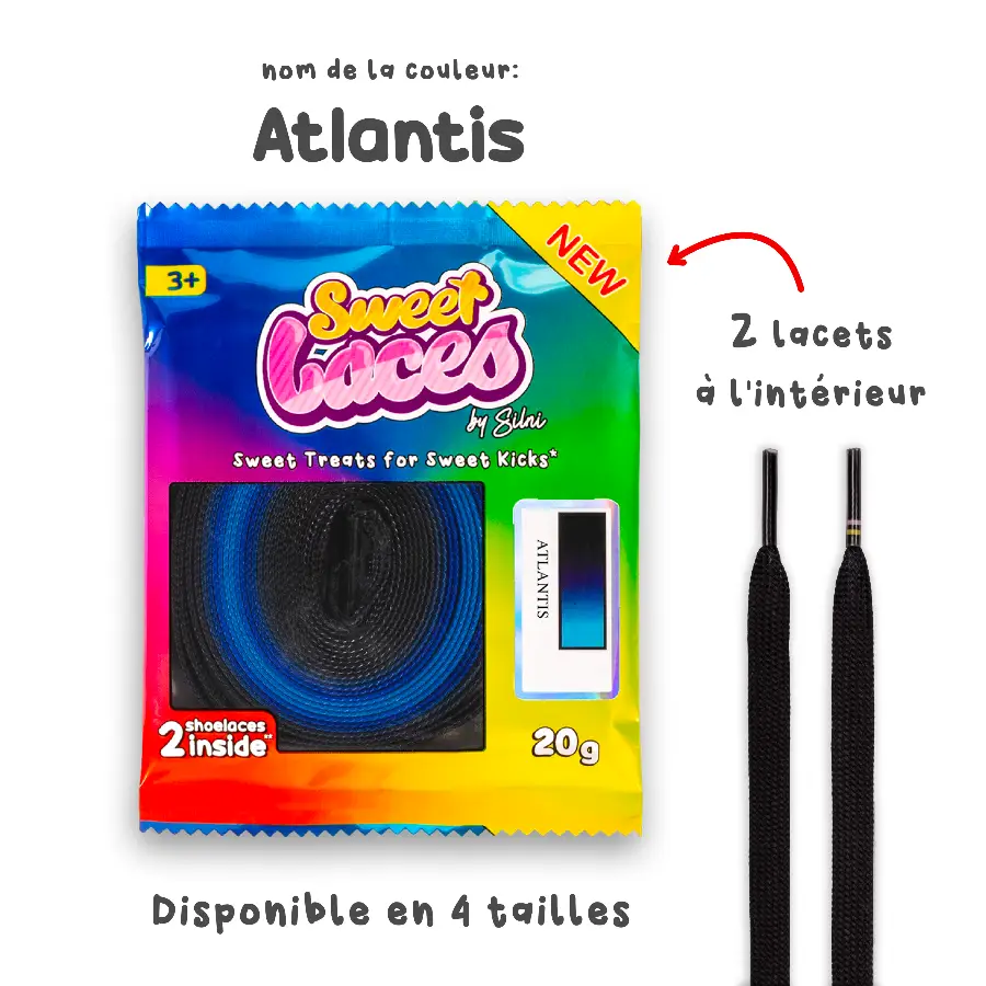 Bienvenue dans les abysses. Avec les lacets Atlantis, embarque pour une expédition stylée dans un océan de bleu profond. Du clair au noir, ce dégradé mystérieux te fera découvrir la légende de la paire perdue 👟🌊