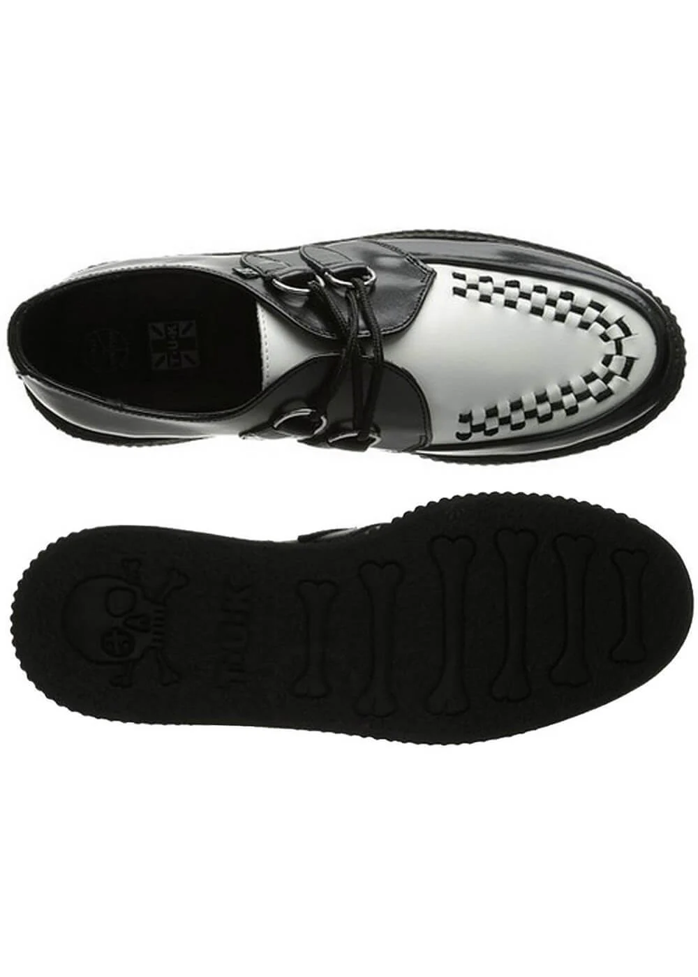 T.u.k propose ces superbes modèles en cuir véritable pour dames et hommes, avec la célèbre semelle creeper de 5 cm à l’arrière et de 4 cm à l’avant. La chaussure se ferme par un lacet qui passe à travers des œillets en D. Le cuir véritable est agréable à porter et la semelle est assez souple. En plus, les dessous sont ornés d’os !
