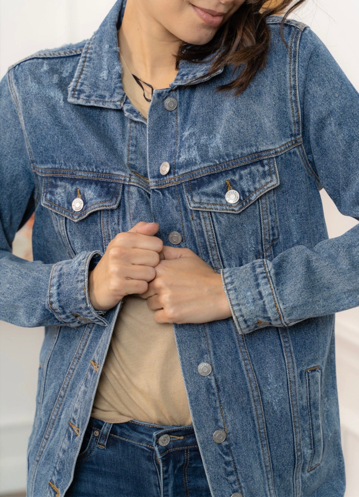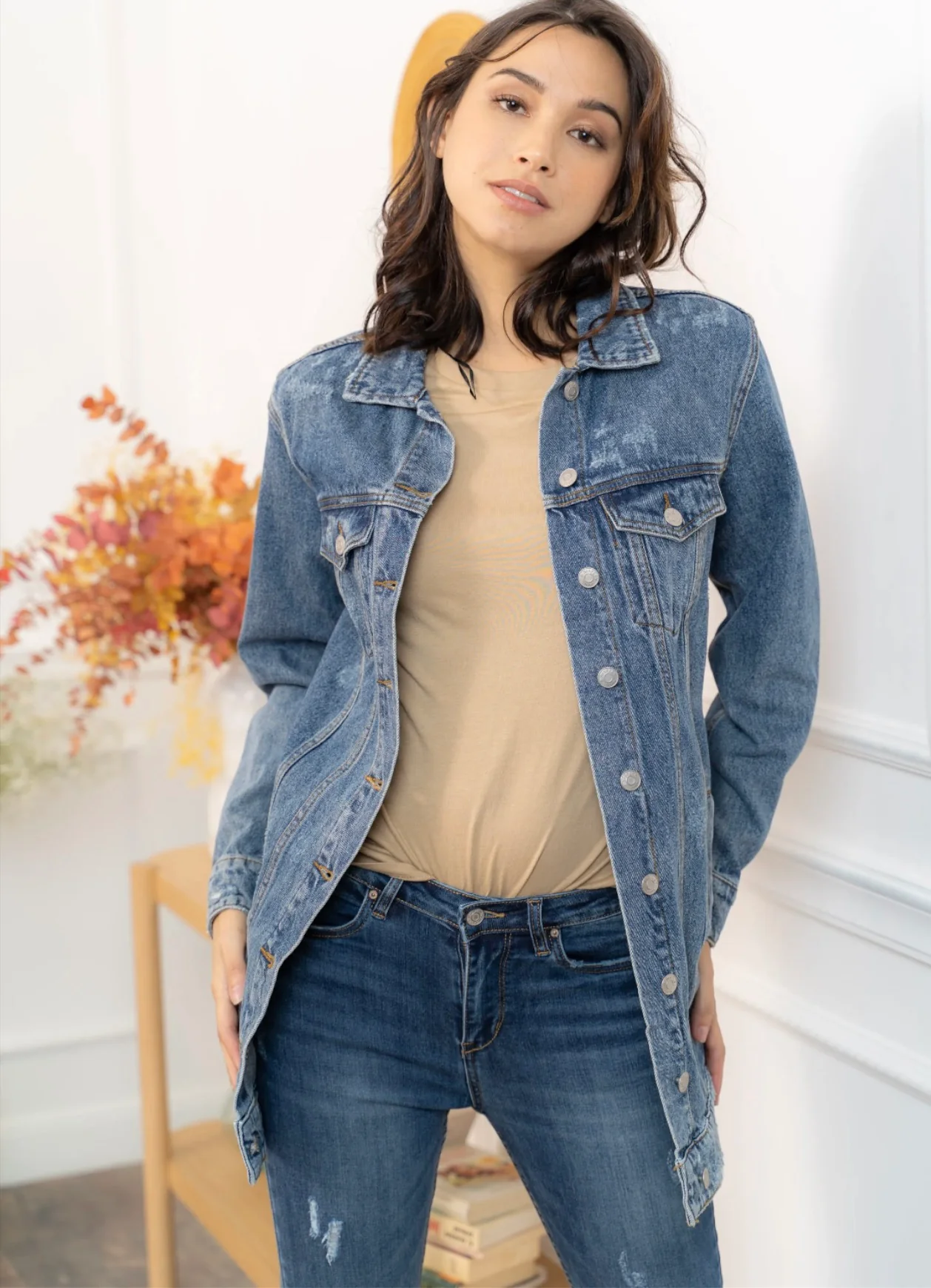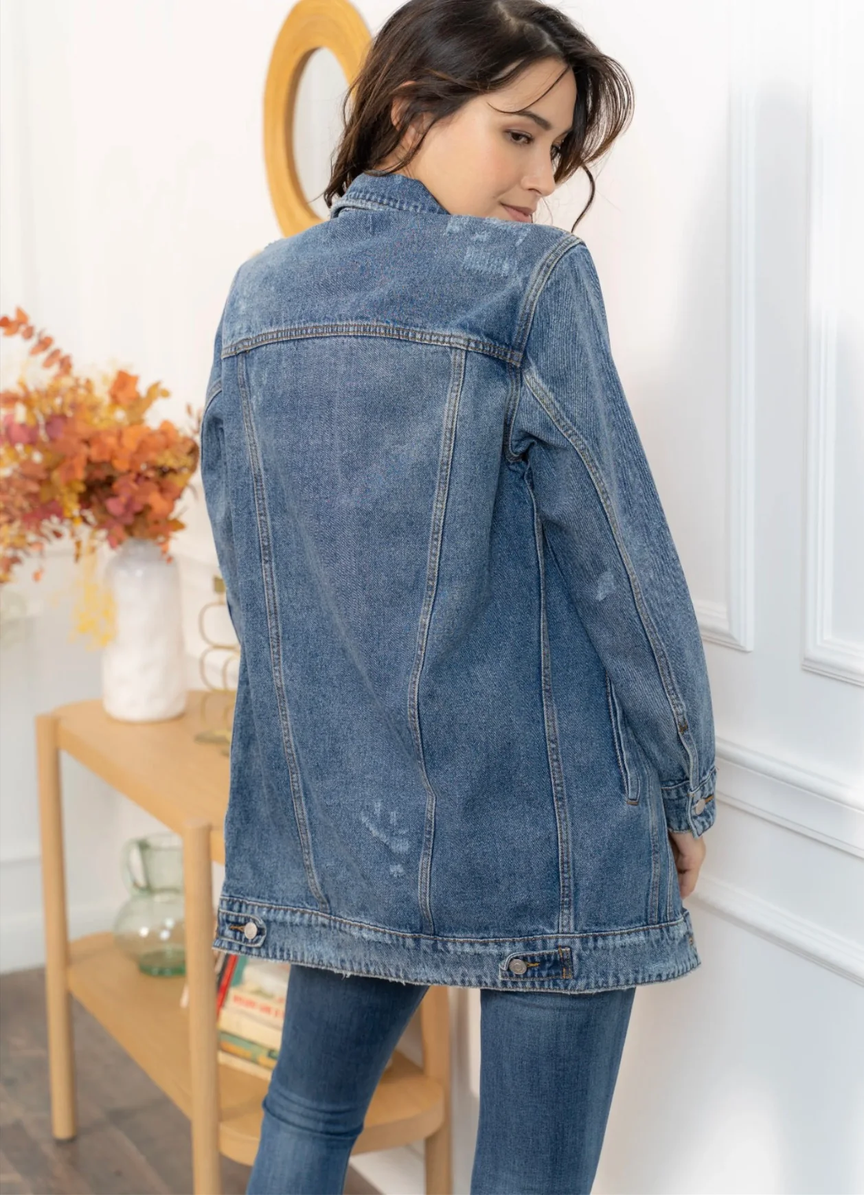 Cette veste en jean longue apporte une touche casual et moderne à toutes les tenues. Sa coupe droite légèrement oversize offre un style décontracté, parfait pour superposer sur un pull, un tee-shirt ou une robe. Le denim authentique, subtilement délavé, lui donne un charme vintage tandis que les boutons métalliques renforcent son esprit intemporel. Pratique et polyvalente, elle se porte au quotidien sans effort.