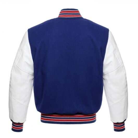 Veste Letterman à rayures bleu roi et rouge avec manches en cuir blanc