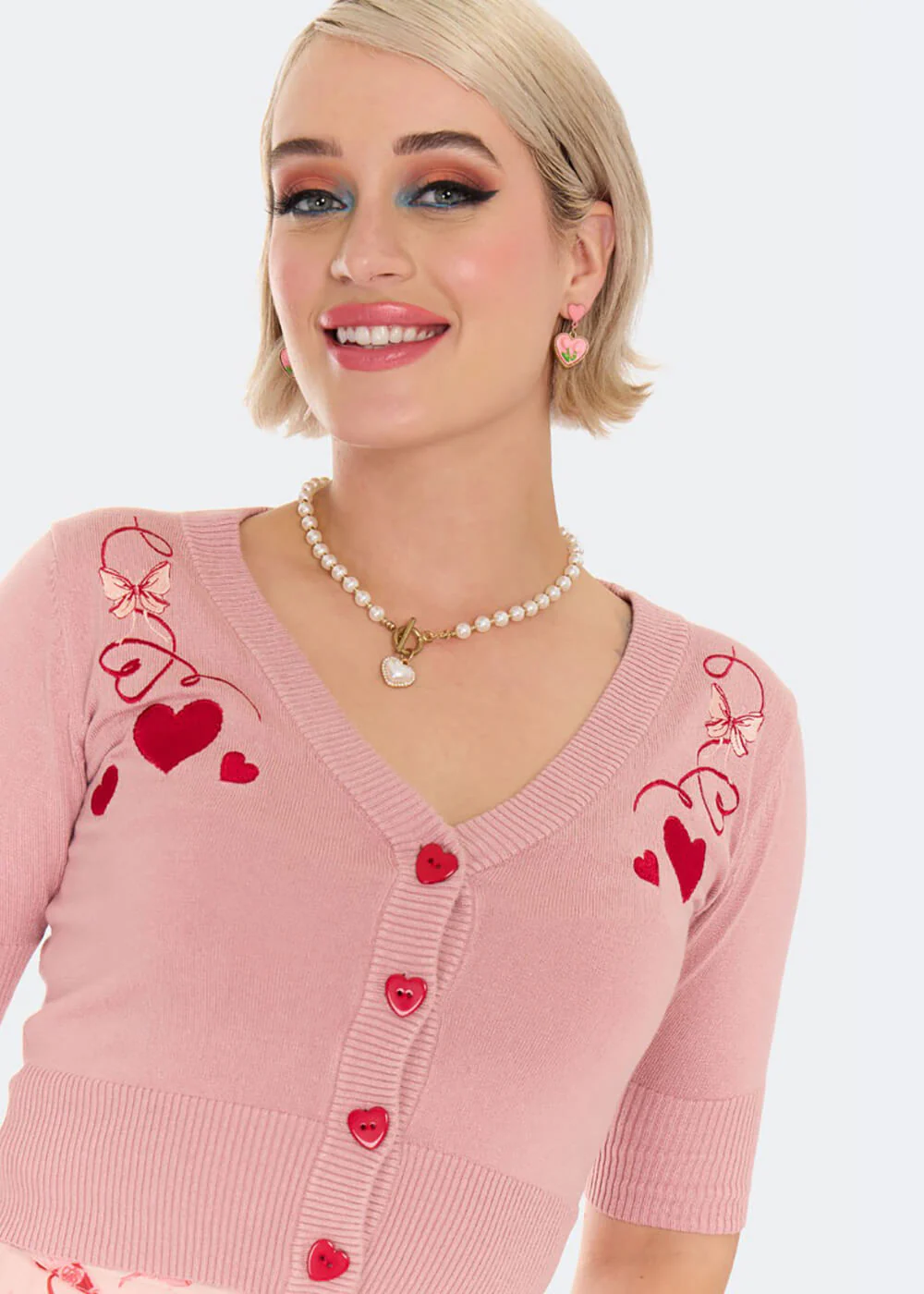 Voodoo Vixen Heart And Ribbon 50’s Cardigan Roze